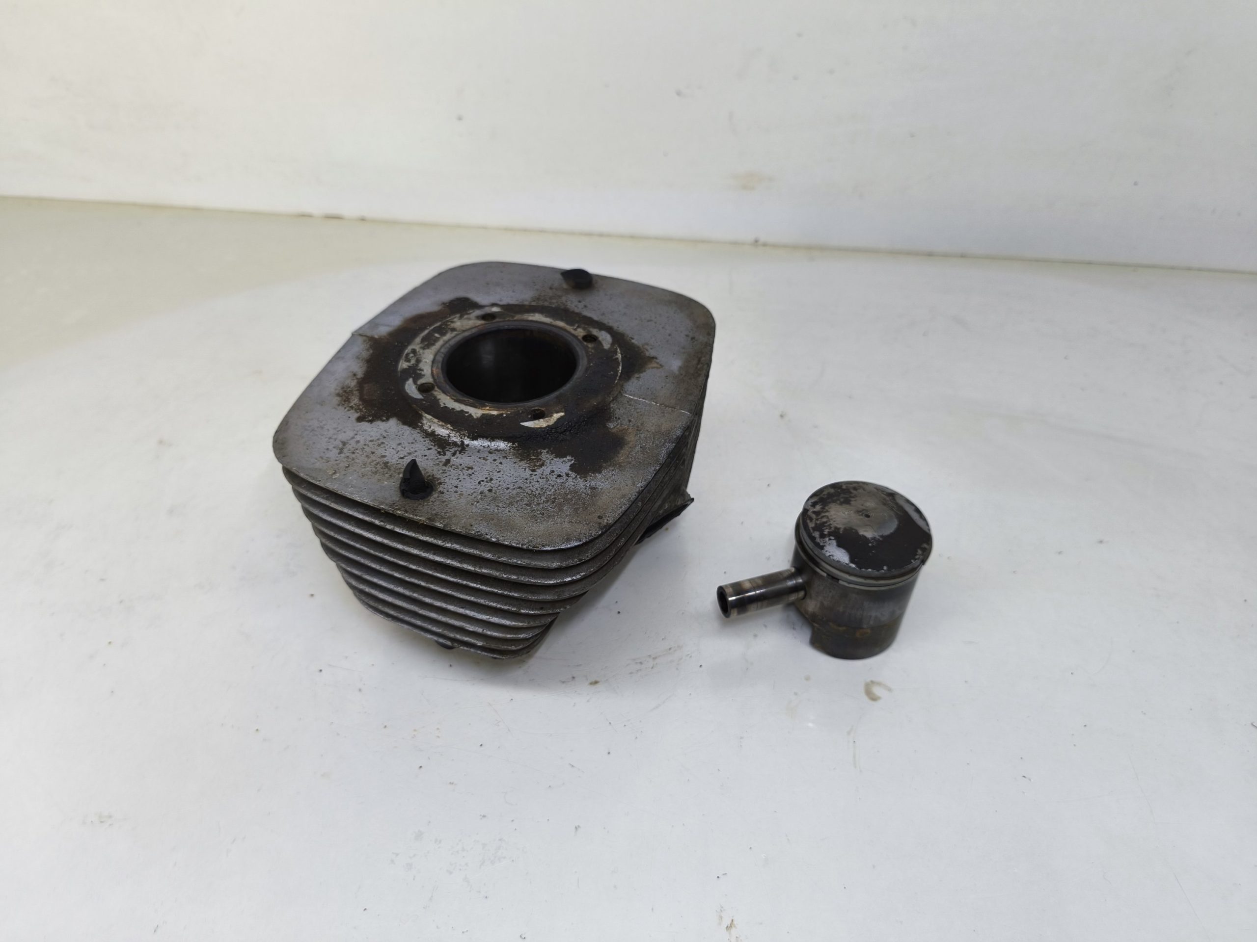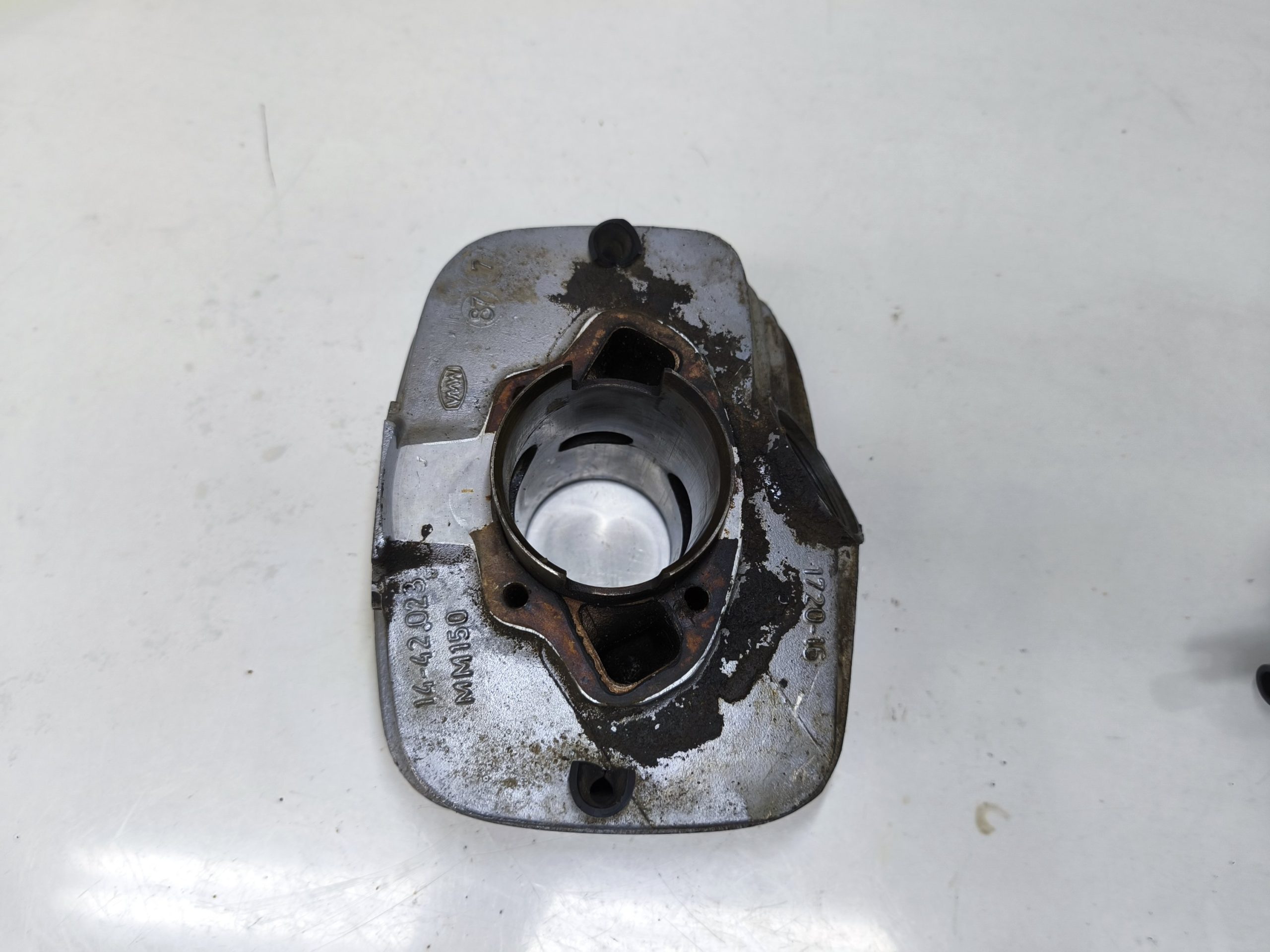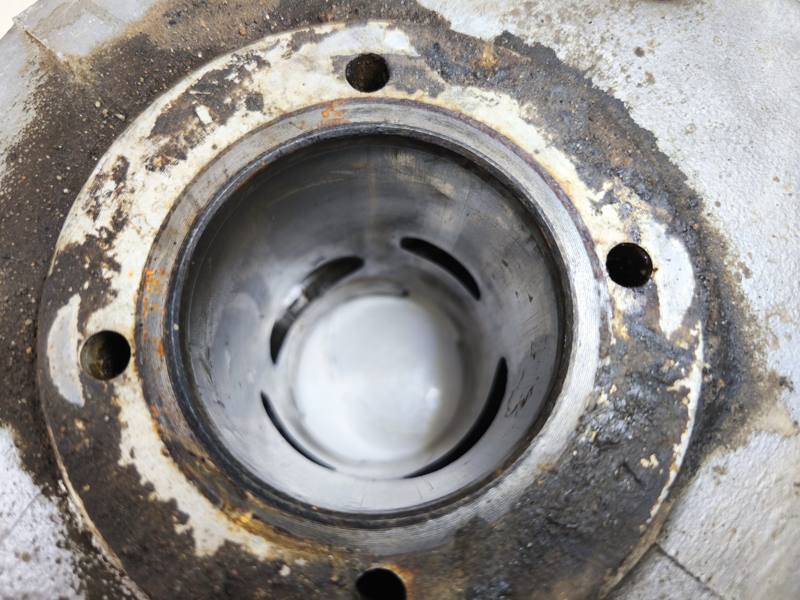 Cylinder silnika MZ TS 150 wymiar 55.98 – tłok oryginalny K20. Gładź w cylindrze bez większych rys w miarę ładna, praktycznie bez progu jedynie można by powierzchnię przehonowac. Żeberka całe. Gwint tłumika ładny.