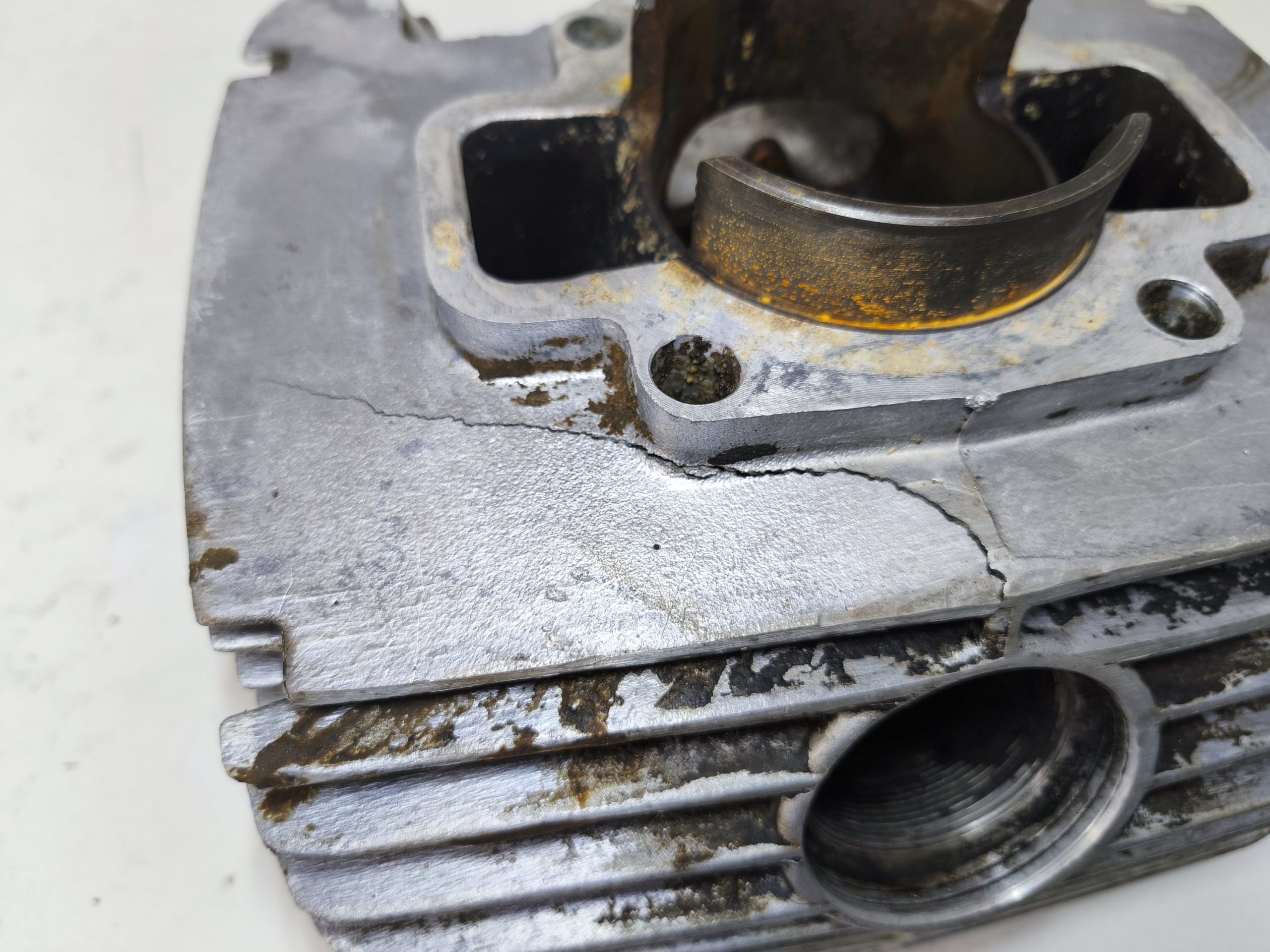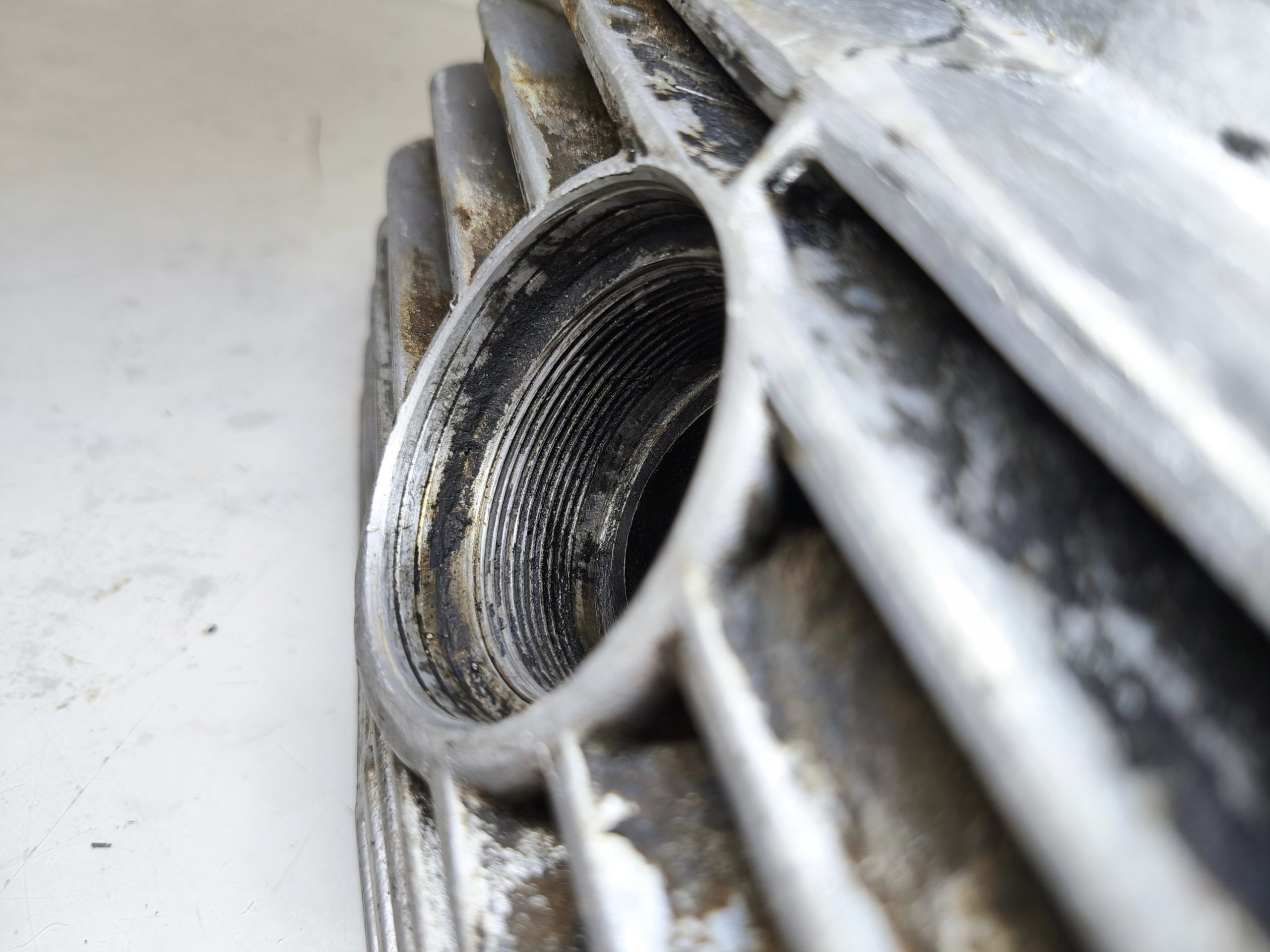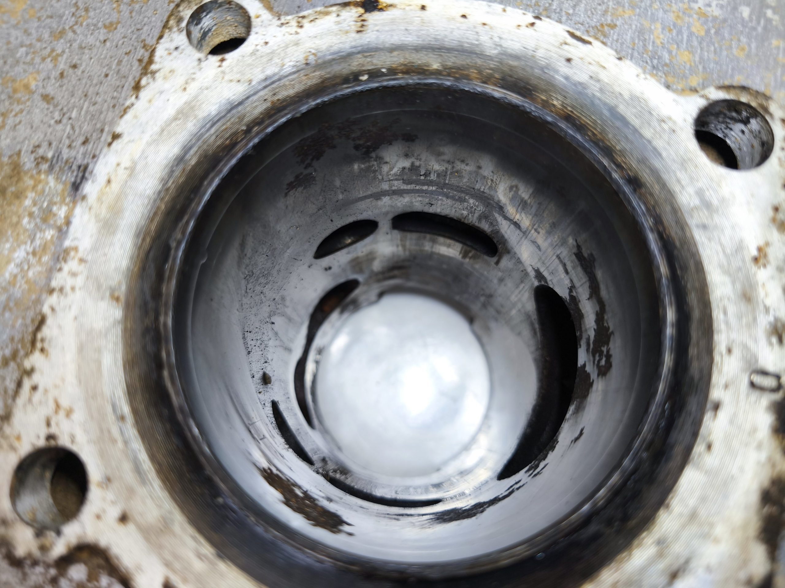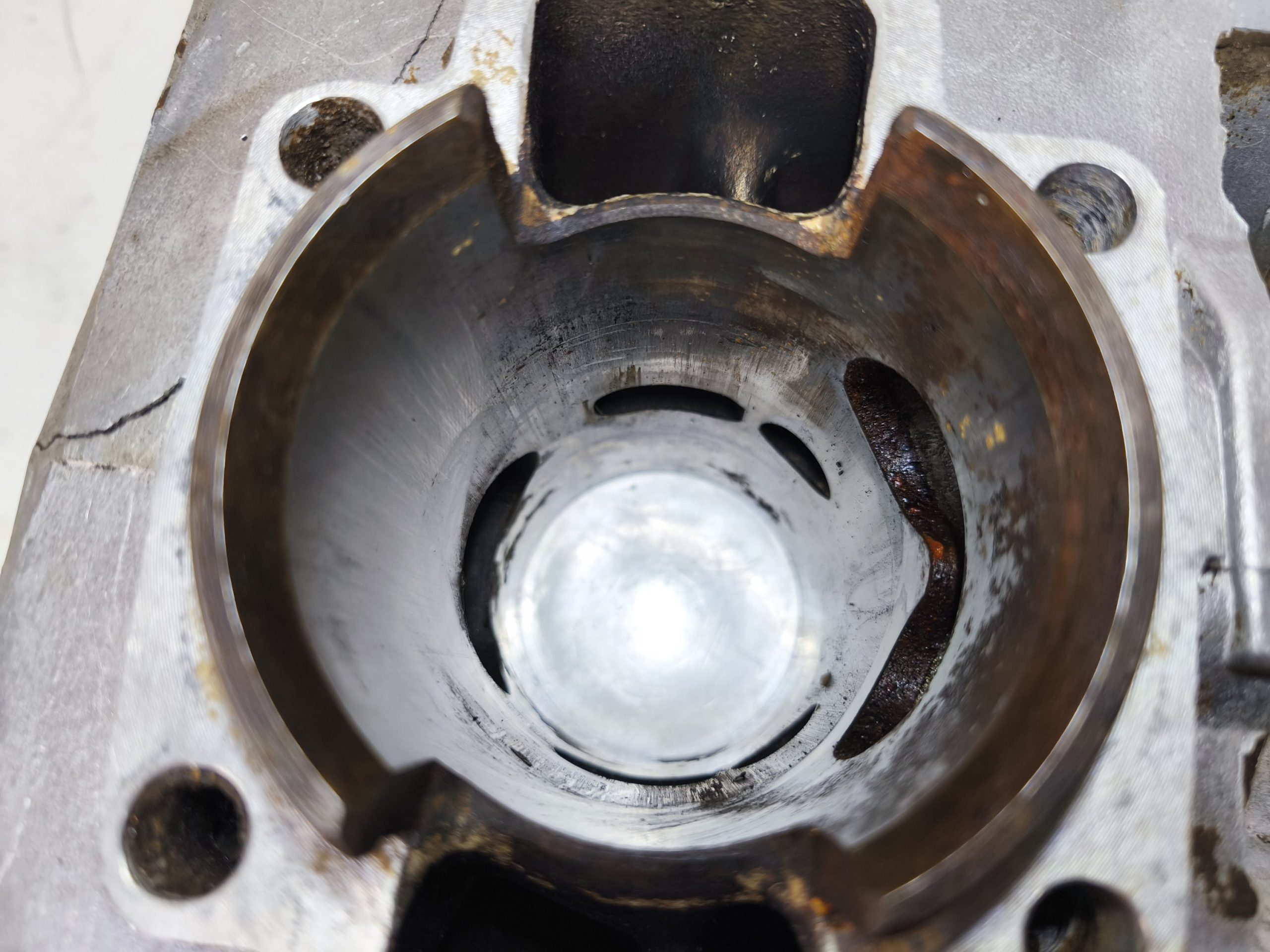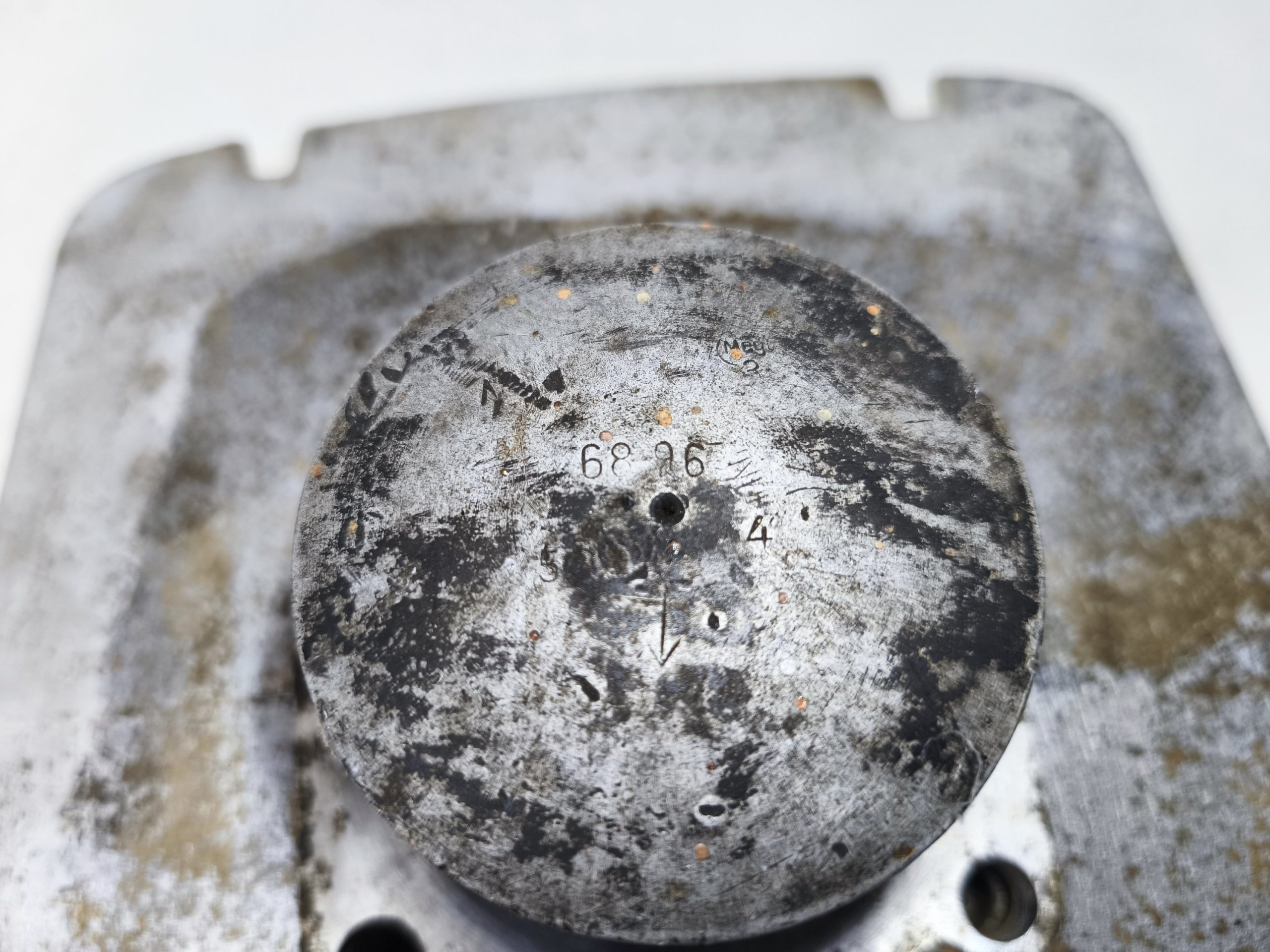 Cylinder silnika MZ ETZ 251 wymiar 68.96 mm – nominalny. Tłok tylko do przymiarki. Cylinder oryginał 251. Gładź cylindryczna pokryta miejscami rudym nalotem – raczej honowanie lub pod szlif. Gwint tłumika dobry stan. Próg lekko wyczuwalny.