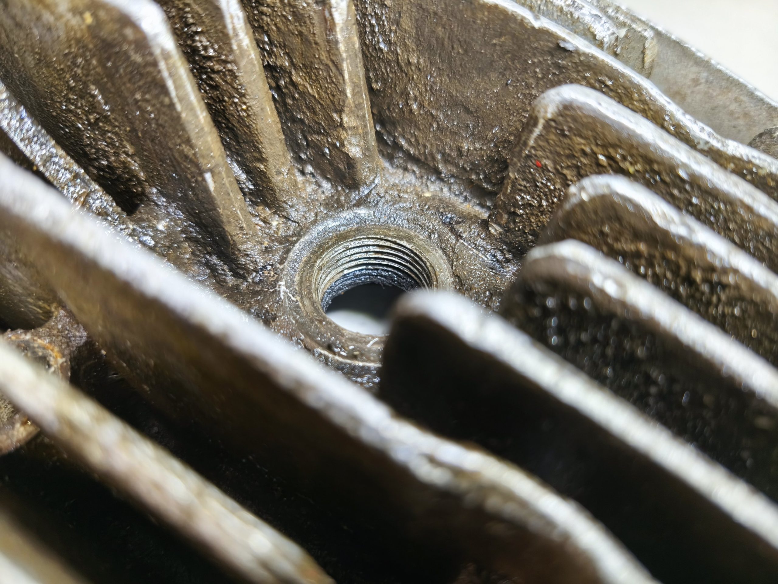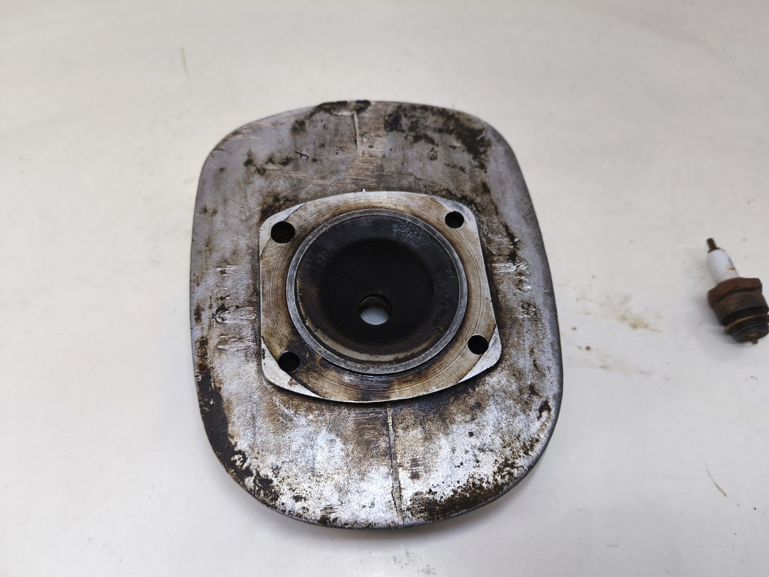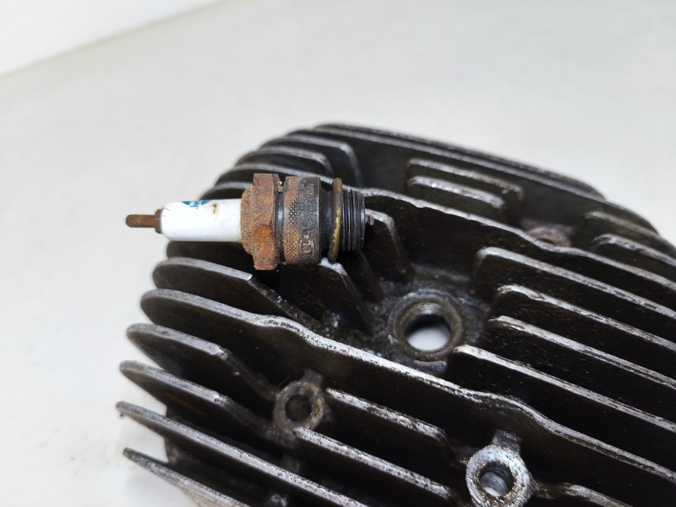 Głowica silnika MZ ES 250 Jaskółka. Głowica w przyzwoitym stanie lecz posiada powiększony otwór na świecę.