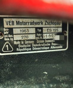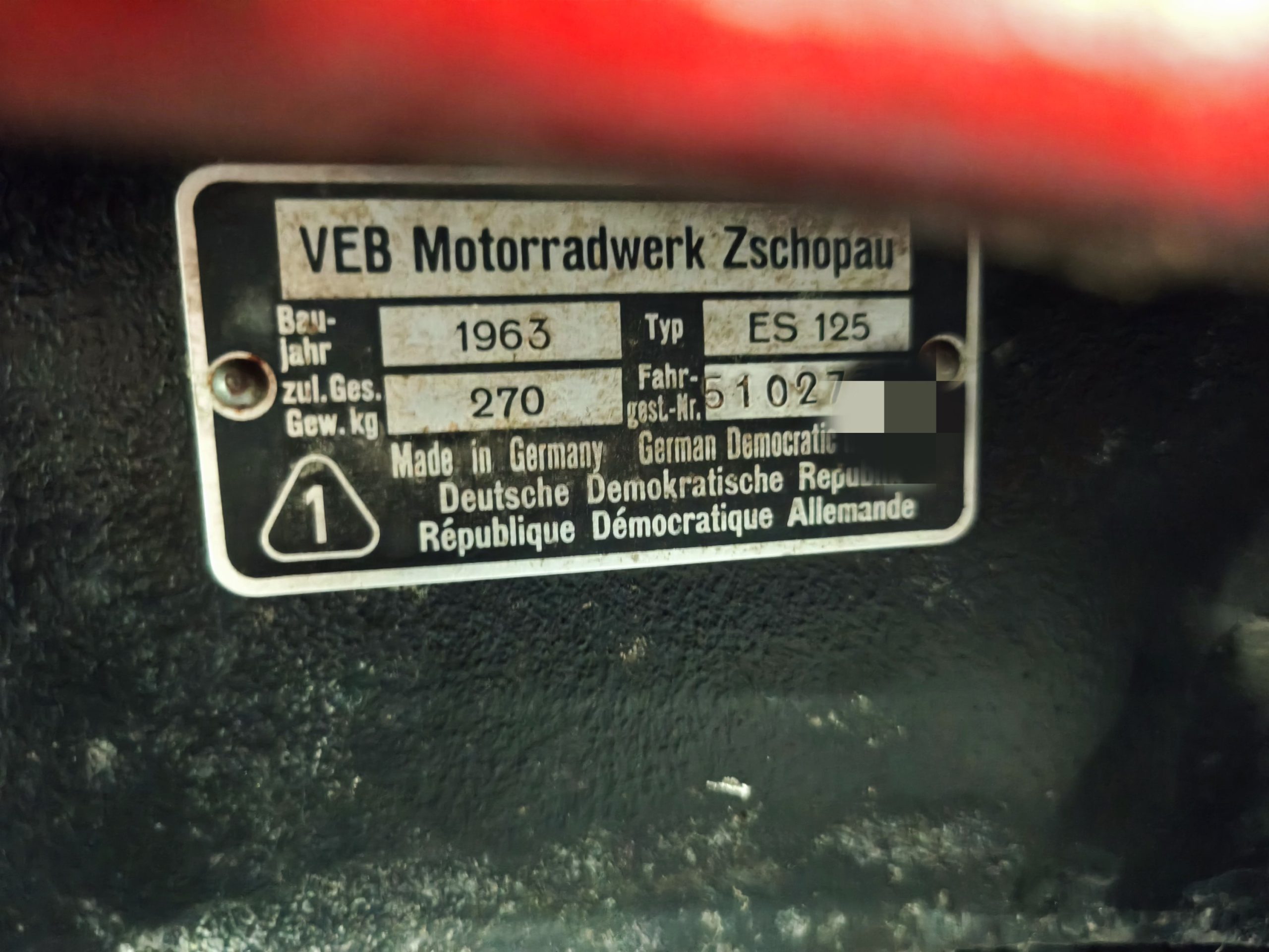 MZ ES 125 1963 rok produkcji. Motocykl nie posiada dokumentów, można zarejestrować na pojazd zabytkowy czyli żółtą tablicę rejestracyjną – MZ nie widnieje w Cepiku.