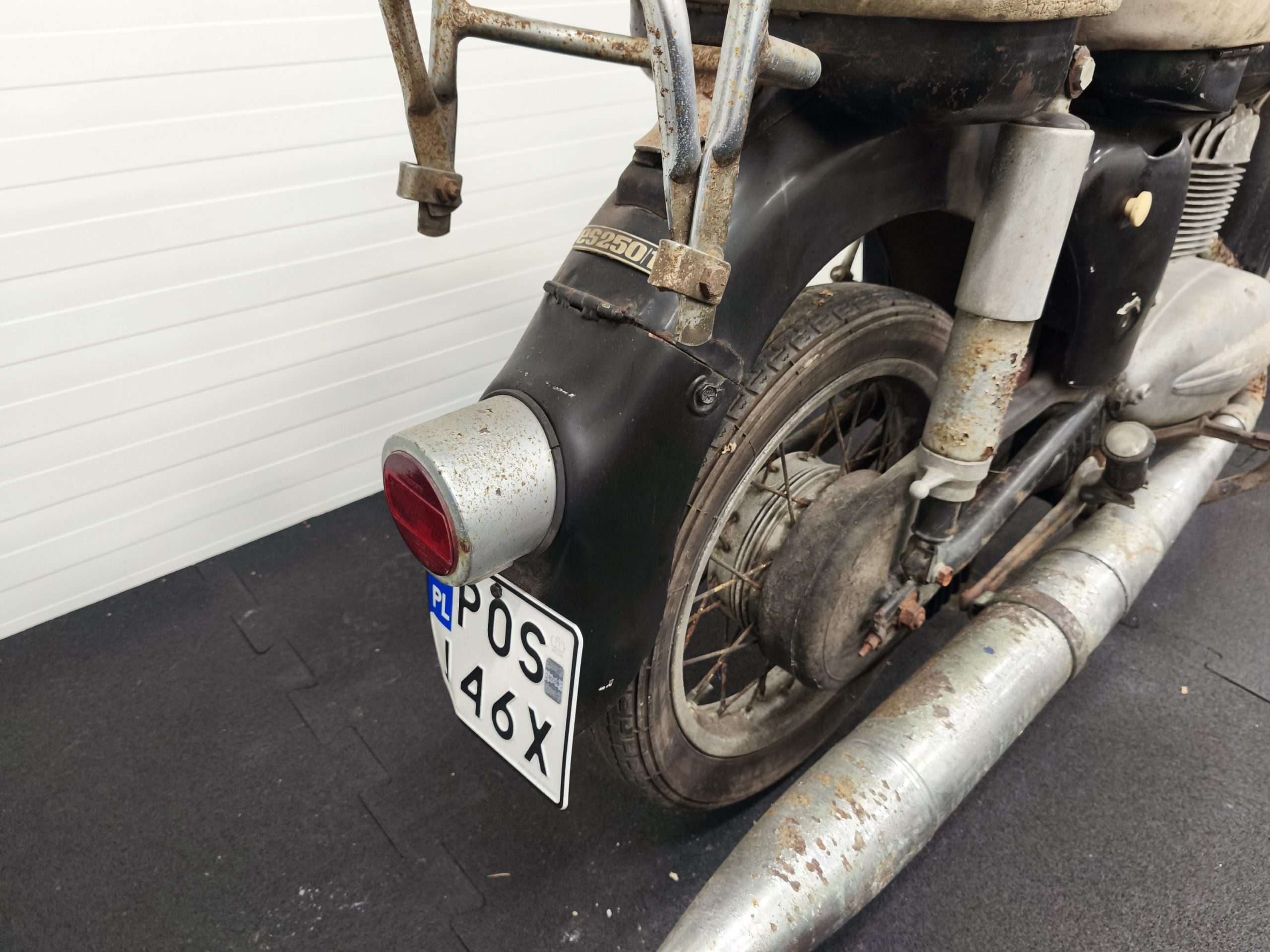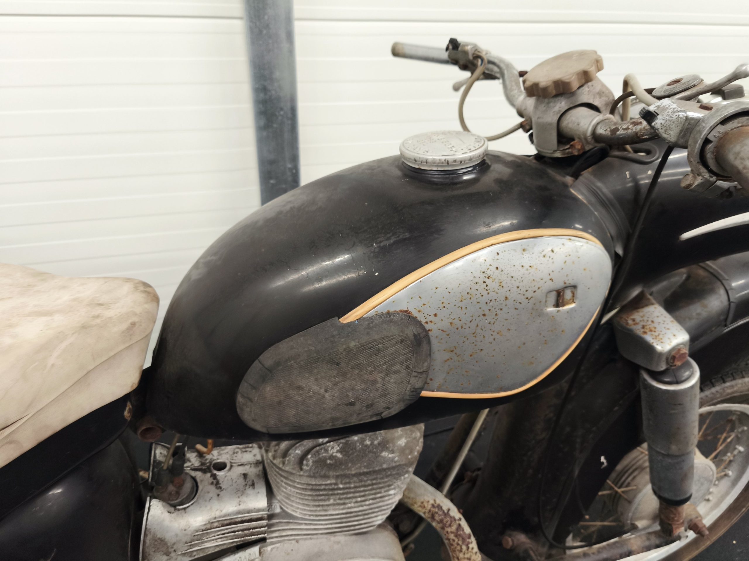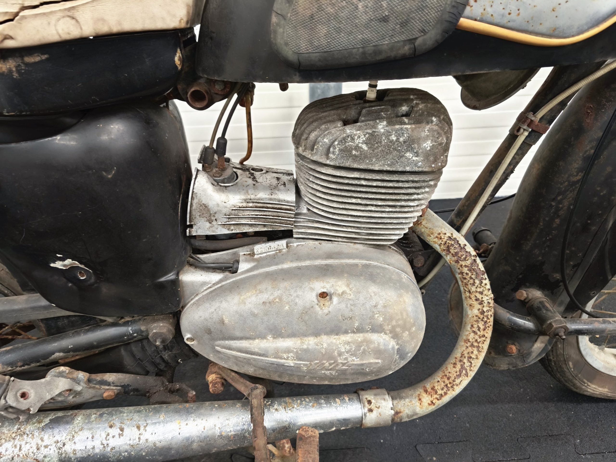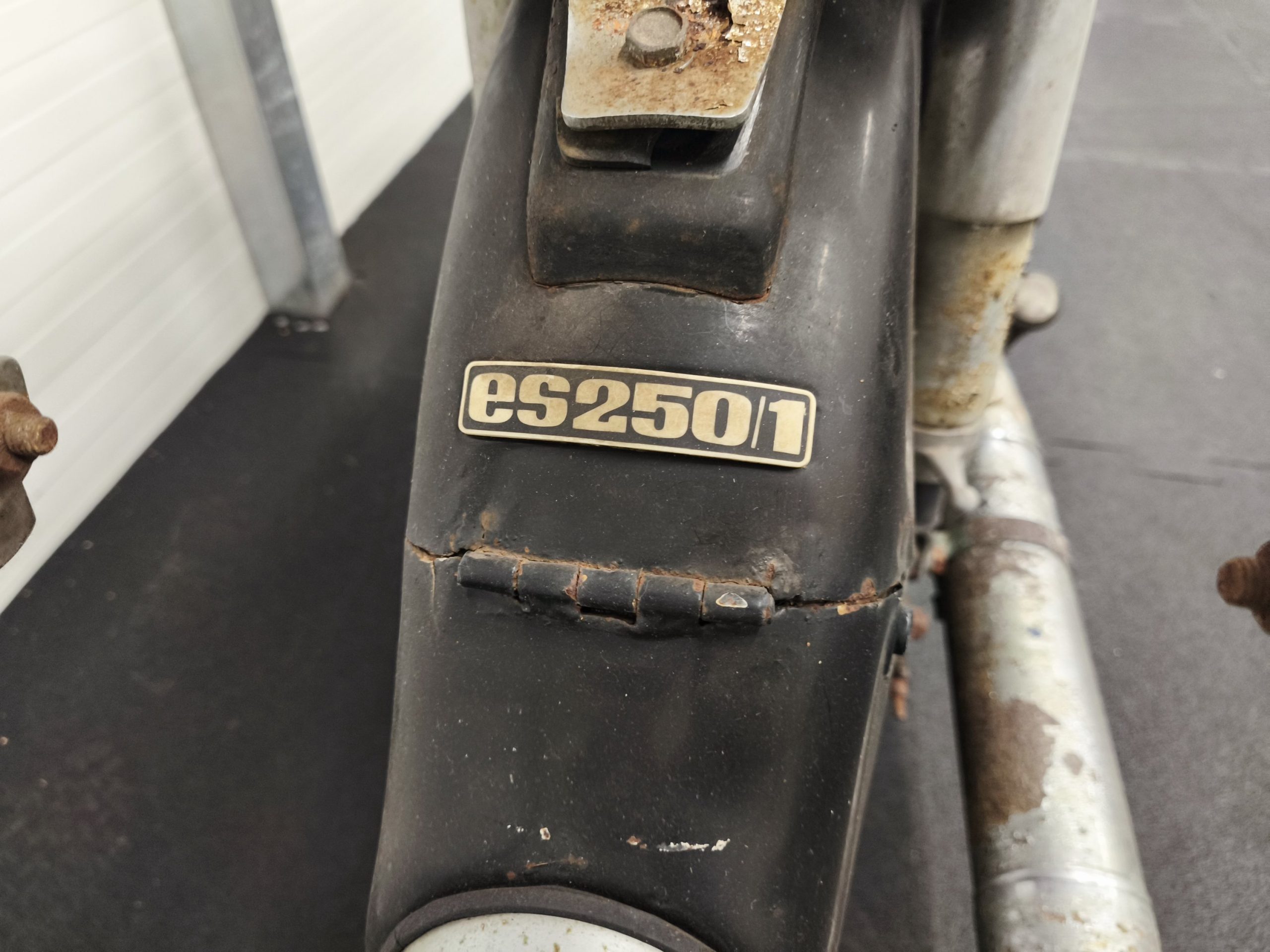Silnik oryginał ES 250/1 kartery od numeru 22.. pokrywał się numerem ze starym dowodem rejestracyjnym. Silnik jest kompletny – jednak przyłapany prawdopodobnie na tłoku, po wciśnięciu dźwigni sprzęgła kopniak się obraca. Oryginalny gaźnik, prądnica oryginalna z przyspieszaczem zapłonu. Po tylu latach nieużytkowania sprzedaje z przeznaczeniem do rewizji – remontu silnika.