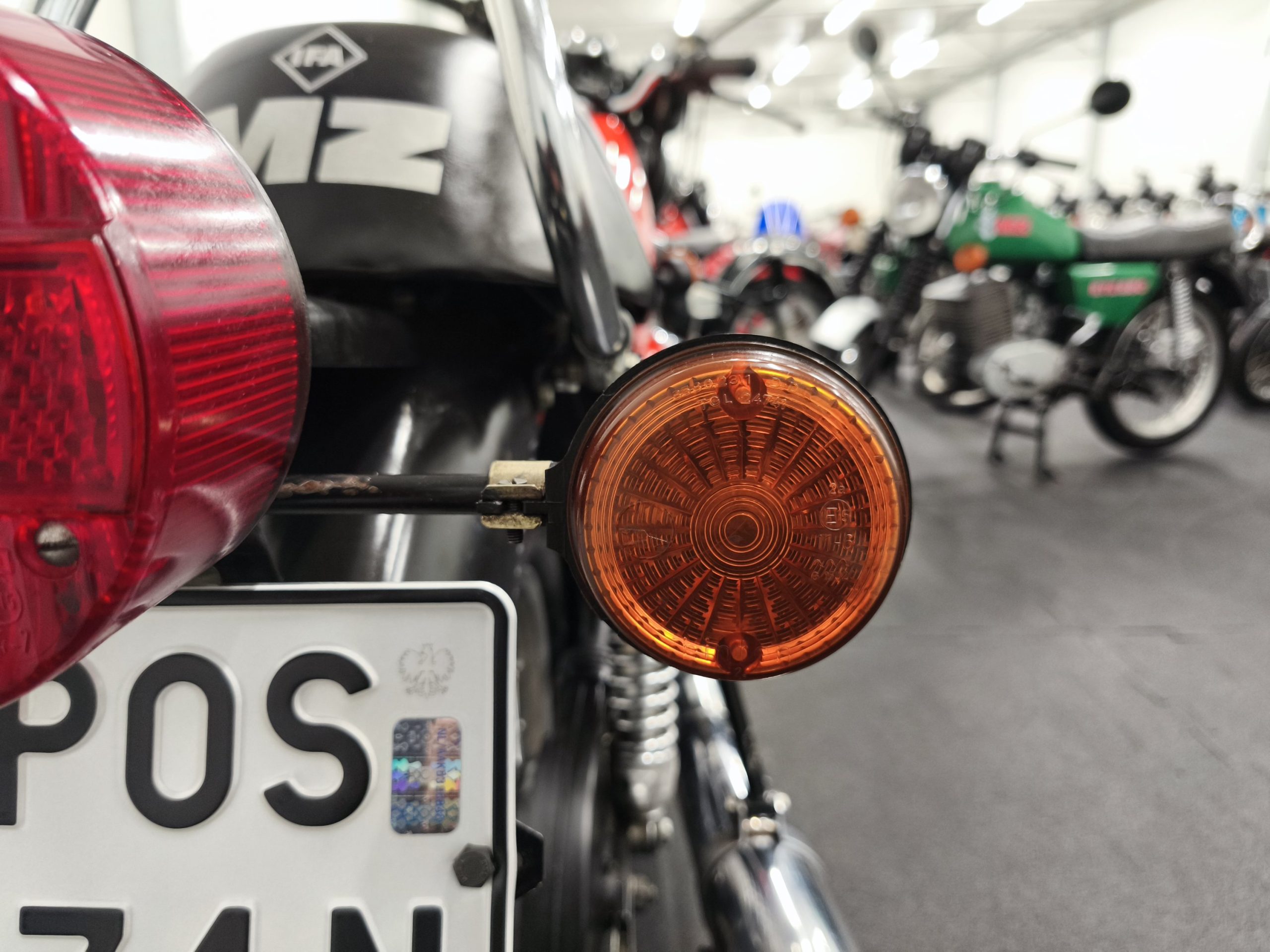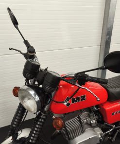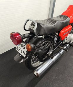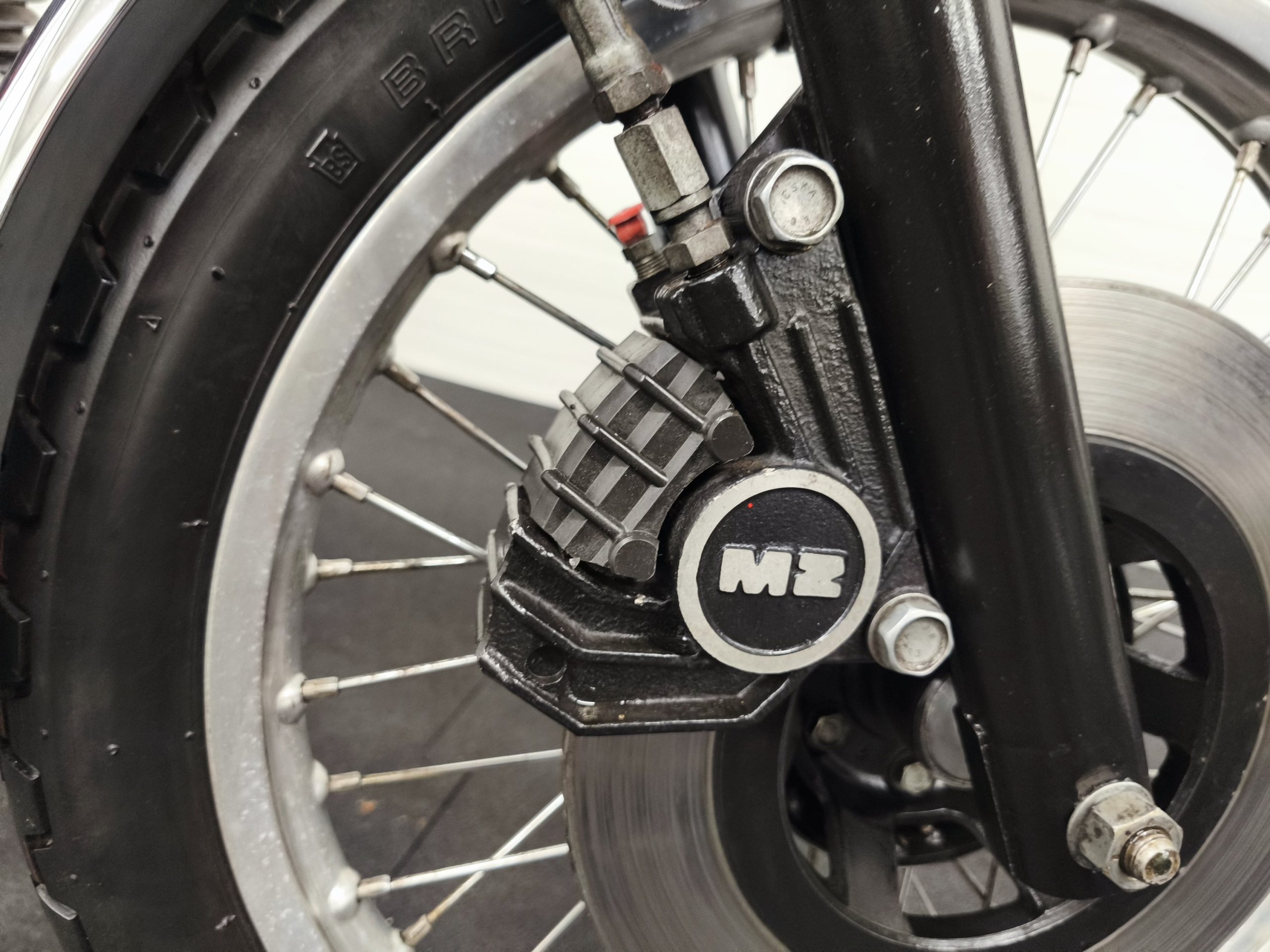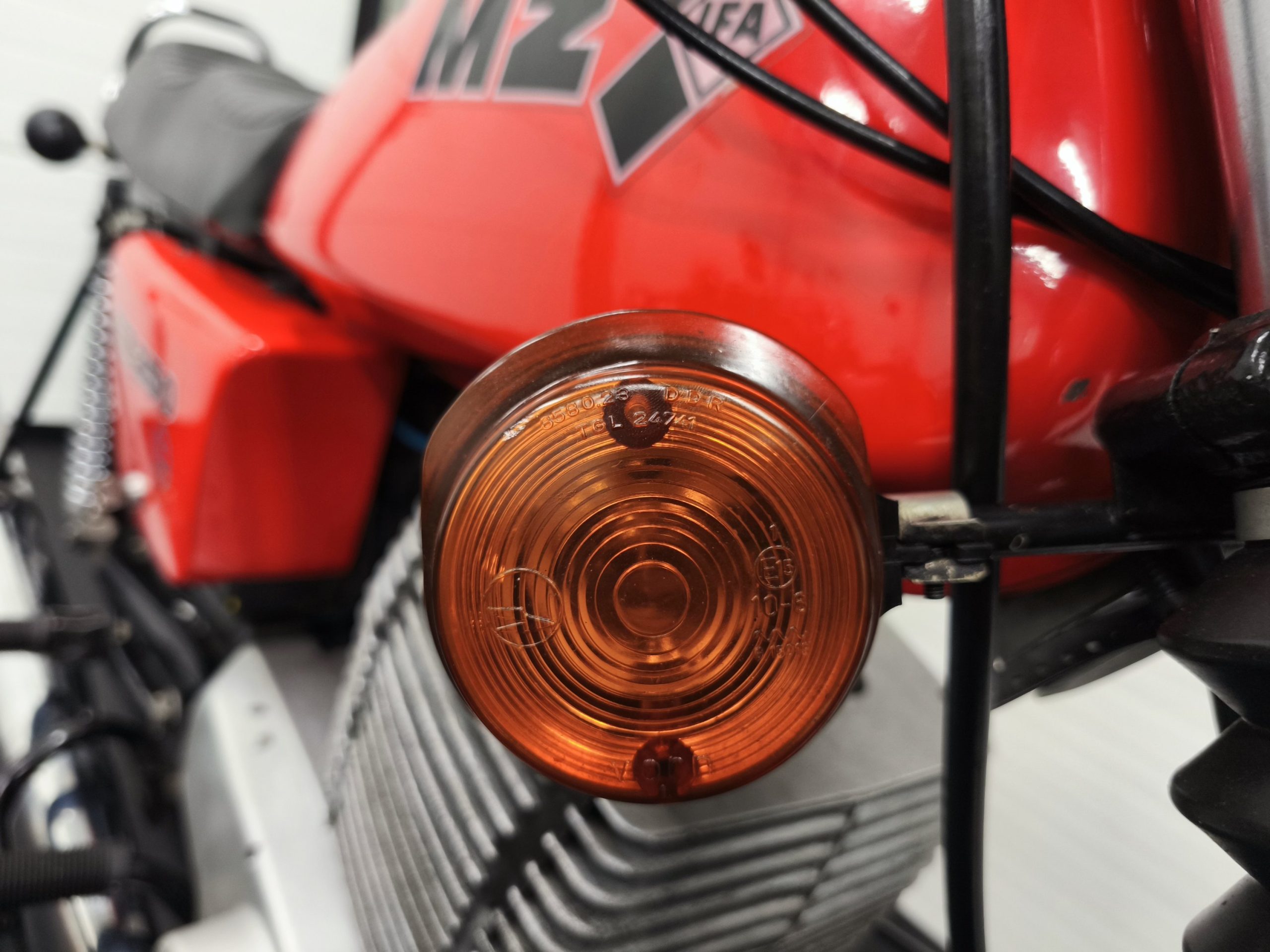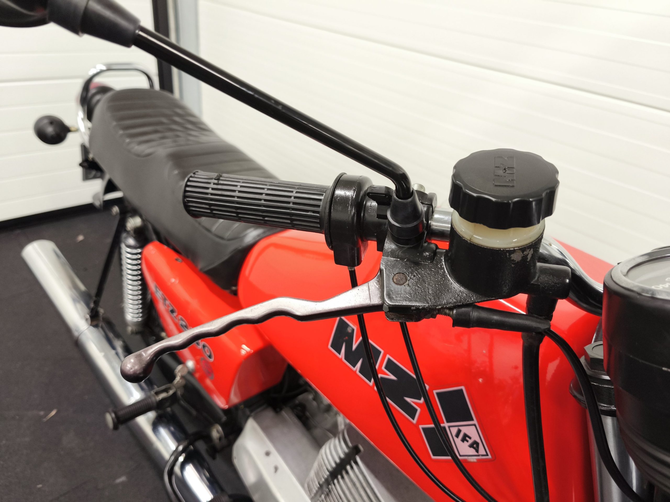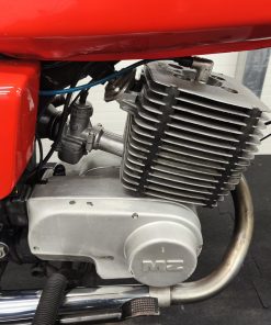 Motocykl zakupiony w Niemczech. Zachowany jest w oryginalnym lakierze oraz w super kompletności pod względem oryginalności części. Lampy, kierunkowskazy, klakson – oryginał – elektryka sprawna. Pięknie zachowane siedzenie. Przedni błotnik chromowany. Zawieszenie przednie po regeneracji. Pompka hamulcowa oraz zacisk oryginalne – sprawne. Bardzo ładnie zachowane felgi (rzadkość w MZ). Pod siedzeniem oryginalna pompka do kół, oraz fabryczny zestaw kluczy naprawczych. Ładnie zachowany tłumik z którego wydobywa się przepiękny dźwięk.