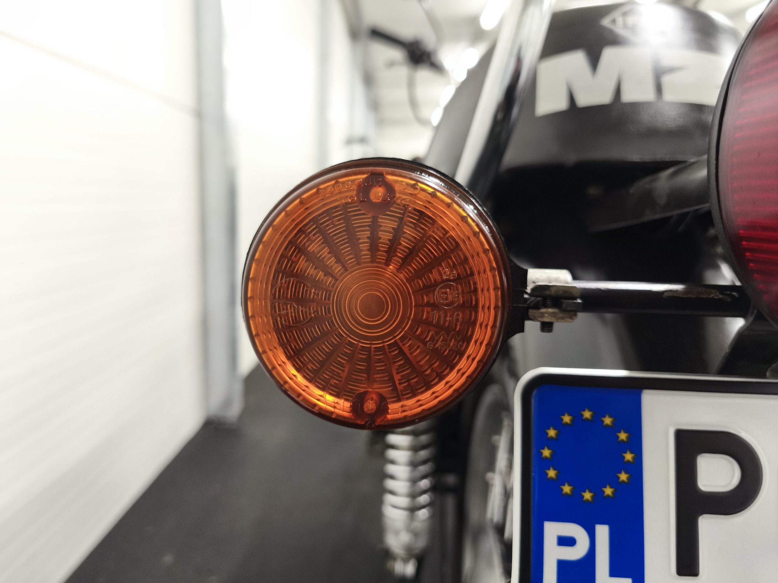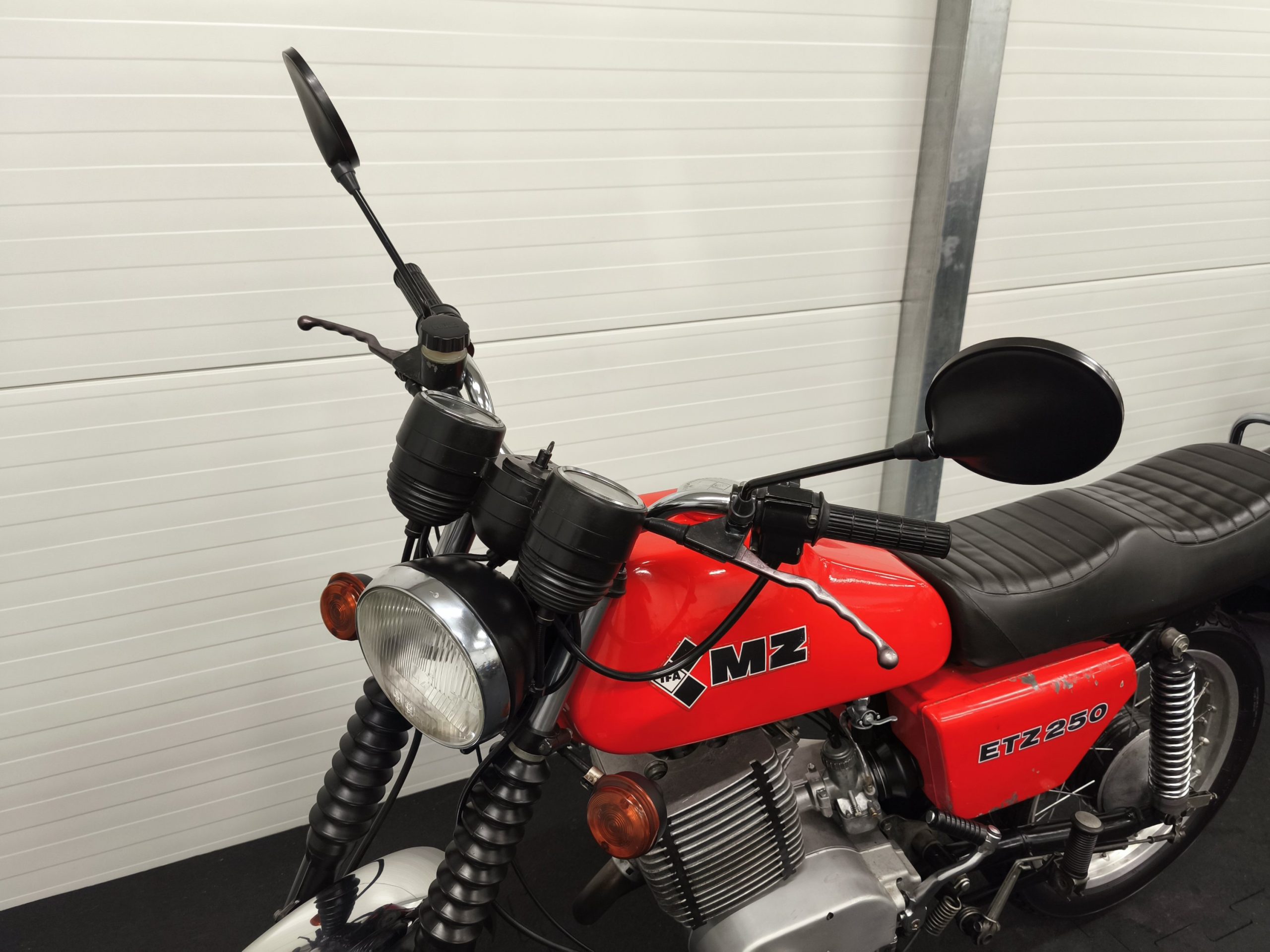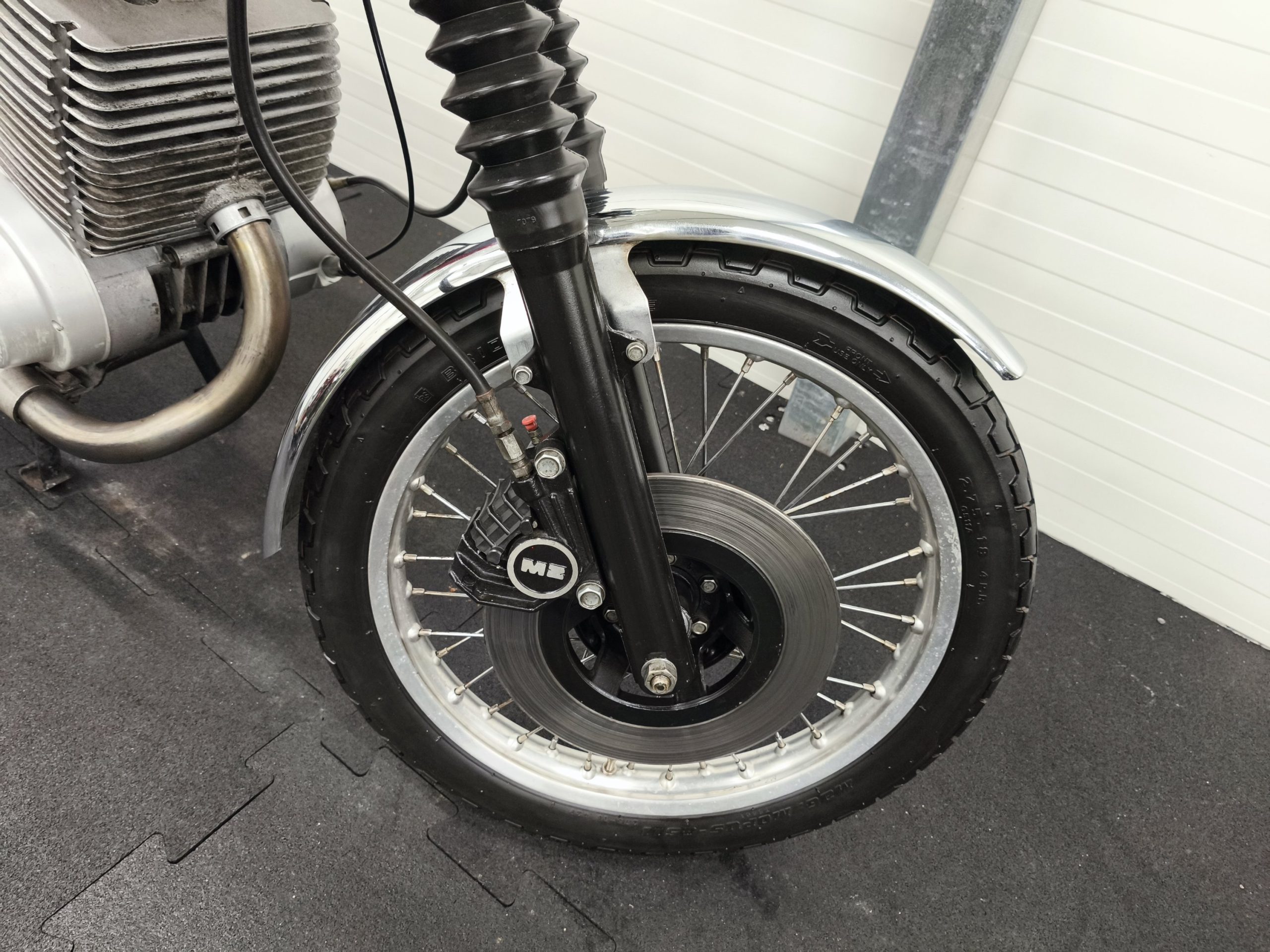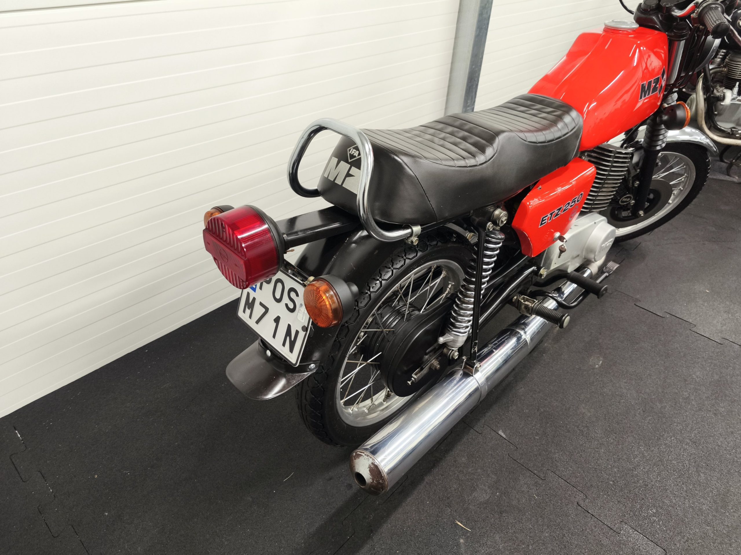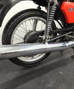Motocykl zakupiony w Niemczech. Zachowany jest w oryginalnym lakierze oraz w super kompletności pod względem oryginalności części. Lampy, kierunkowskazy, klakson – oryginał – elektryka sprawna. Pięknie zachowane siedzenie. Przedni błotnik chromowany. Zawieszenie przednie po regeneracji. Pompka hamulcowa oraz zacisk oryginalne – sprawne. Bardzo ładnie zachowane felgi (rzadkość w MZ). Pod siedzeniem oryginalna pompka do kół, oraz fabryczny zestaw kluczy naprawczych. Ładnie zachowany tłumik z którego wydobywa się przepiękny dźwięk.