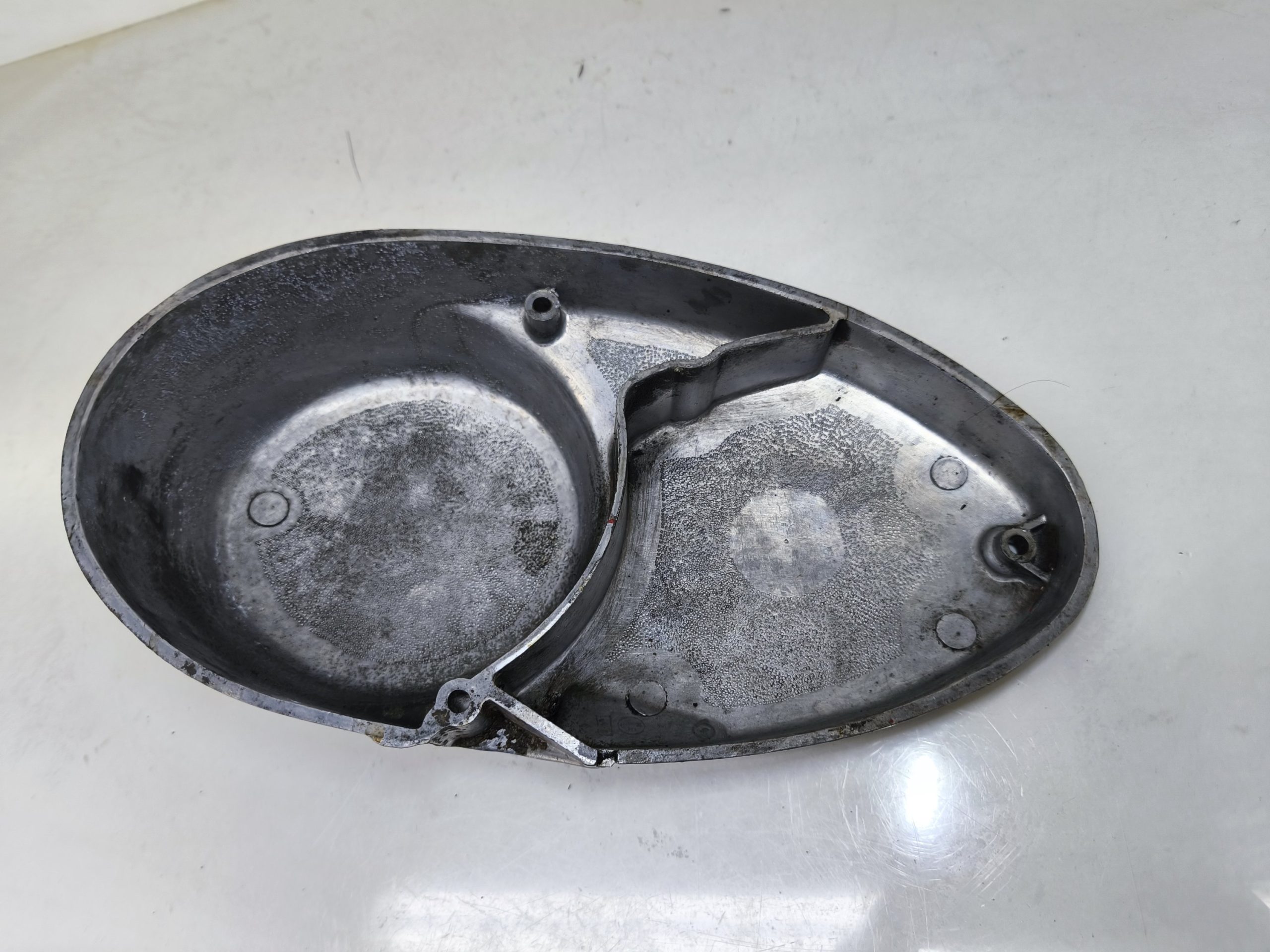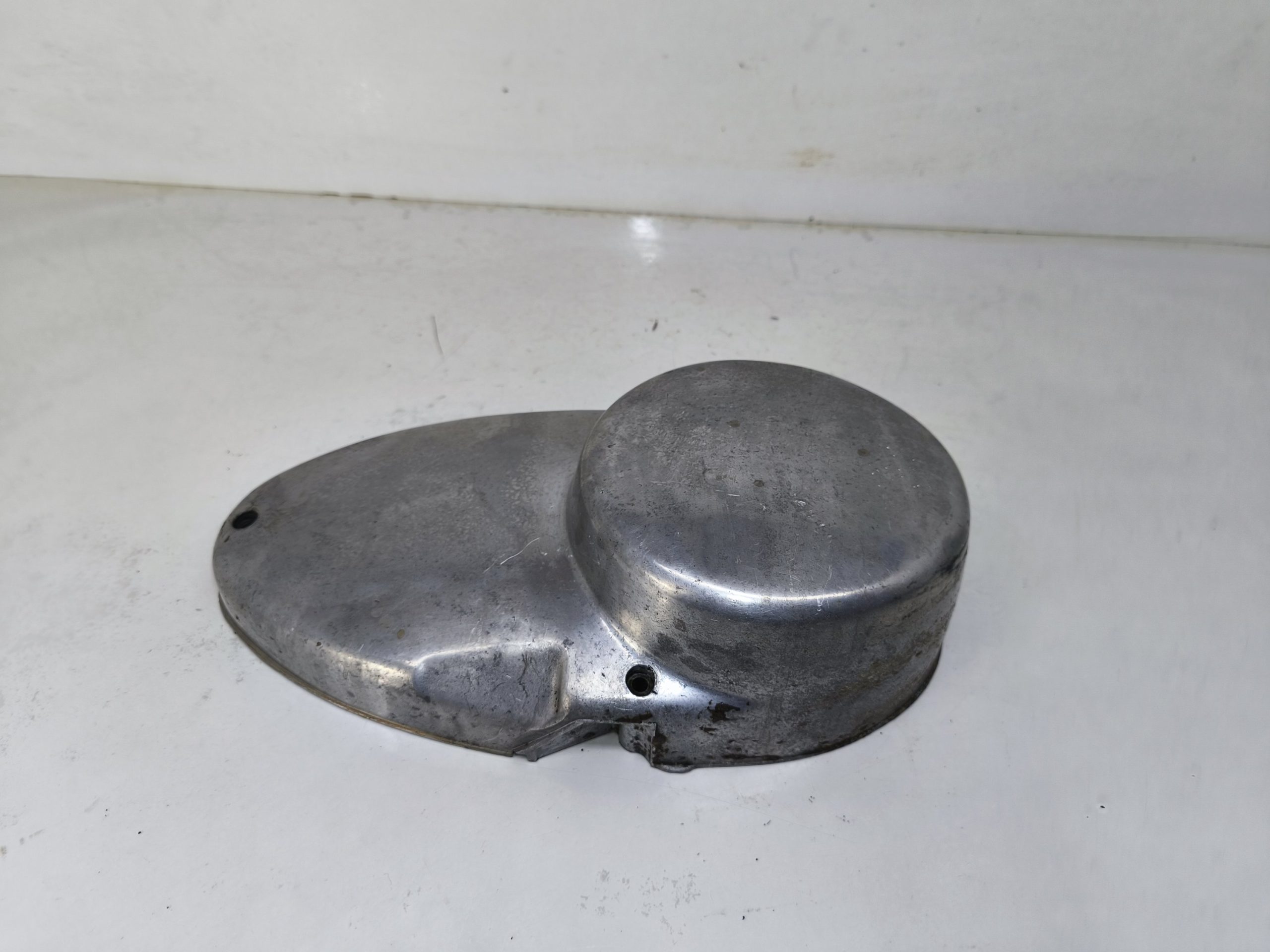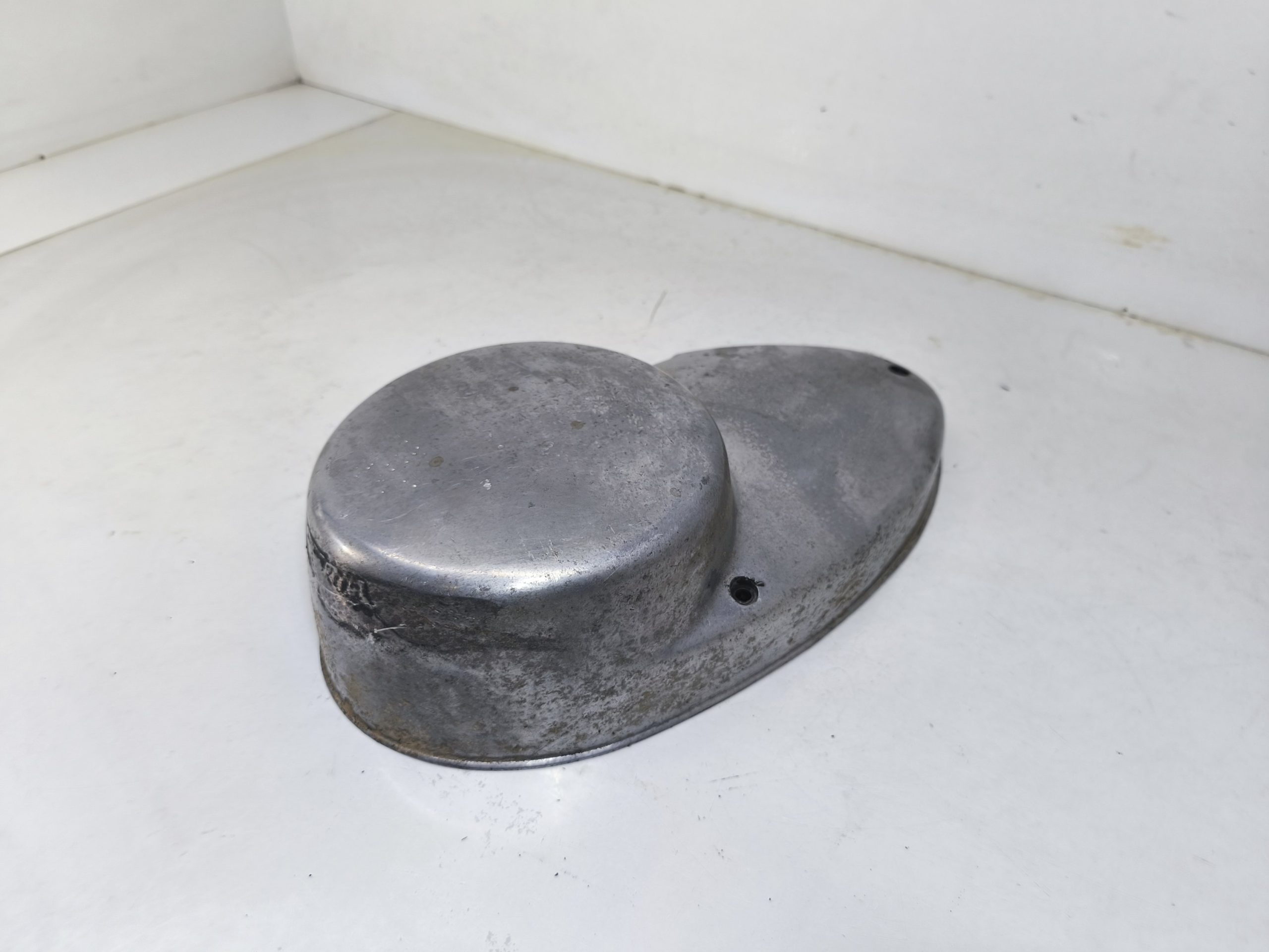 Pokrywa prądnicy MZ ES 250/2 Trophy. Stan dość średni, posiada kilka głębszych rys oraz przetarcie widoczne na ostatnim zdjęciu – dlatego sprzedaję jak „uszkodzoną”.