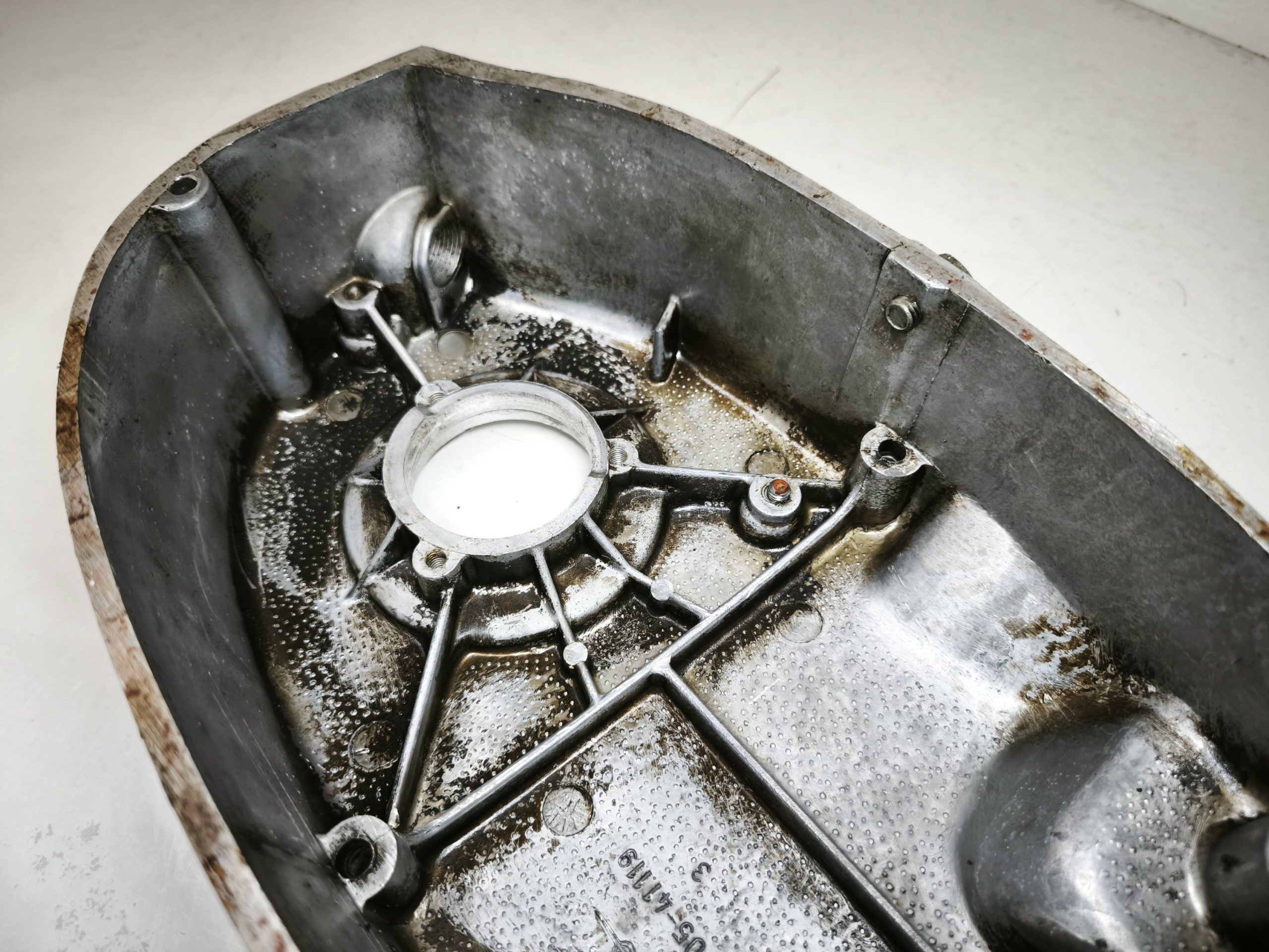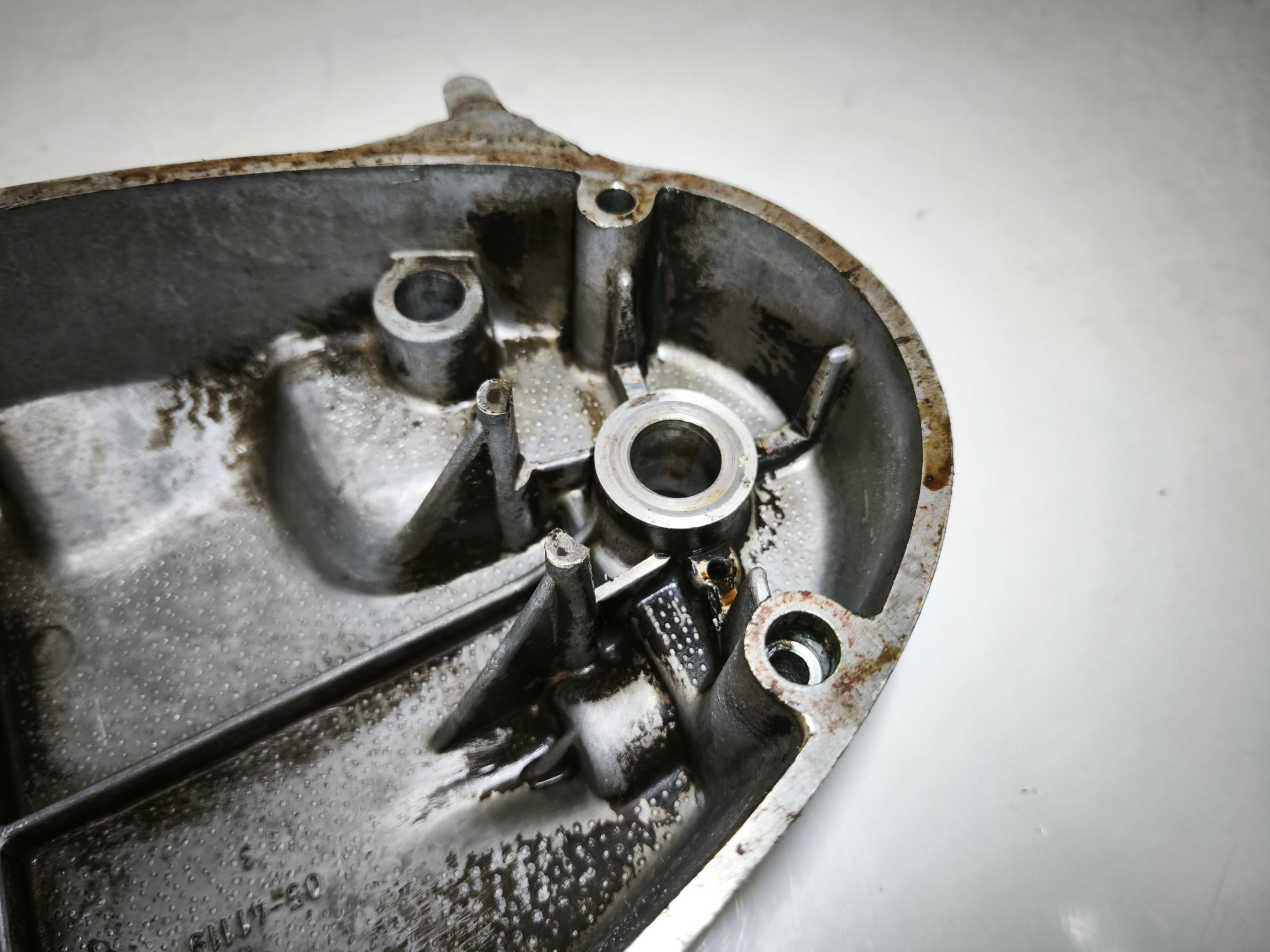 Pokrywa sprzęgła silnika MZ ES 250/2 Trophy. Stan dość ładny. Kilka powierzchownych rys oraz kilka głębszych. Gwint tulei w ładnym stanie. Małe gwinty ok.