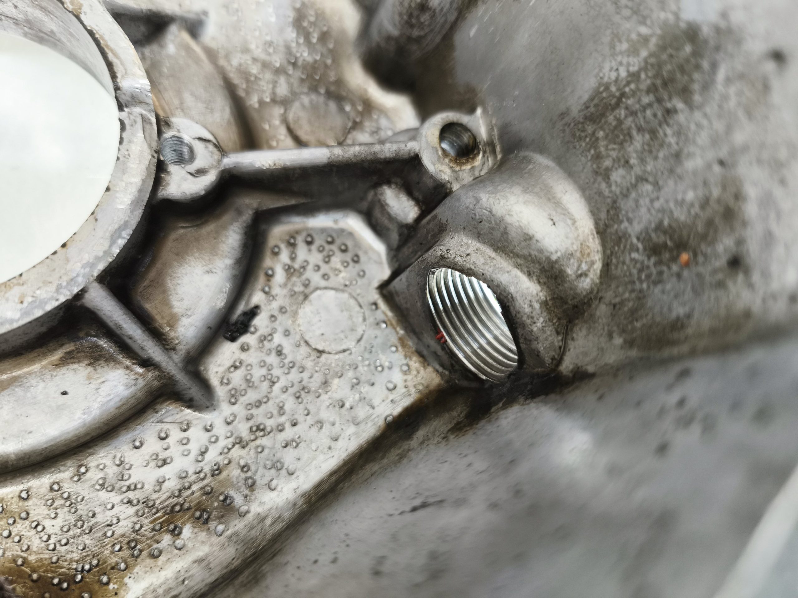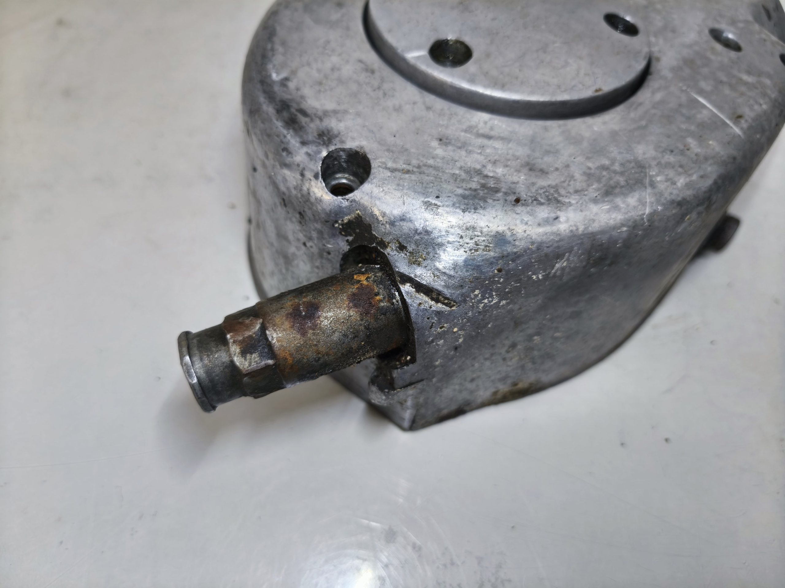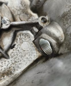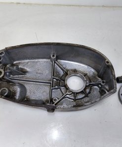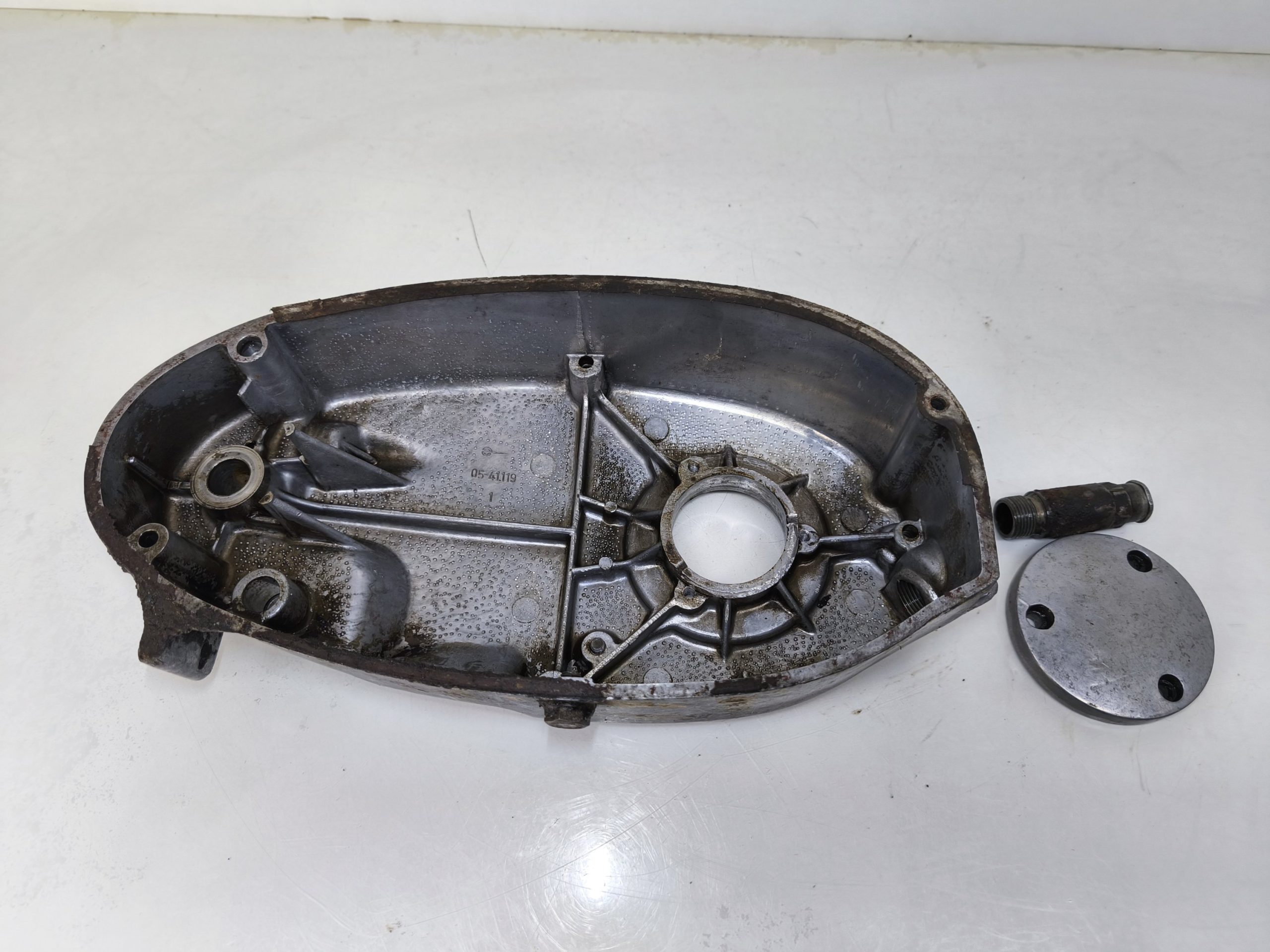 Pokrywa sprzęgła silnika MZ ES 250/2 Trophy. Gwinty małe ok, gwint tulejki również ładny. Pokrywa posiada dość sporą ryskę oraz przetarcia przy tulejce linki sprzęgła – raczej nie powinno mieć to wpływu na dalsze użytkowanie jednak przez to sprzedaje jak „uszkodzoną”.