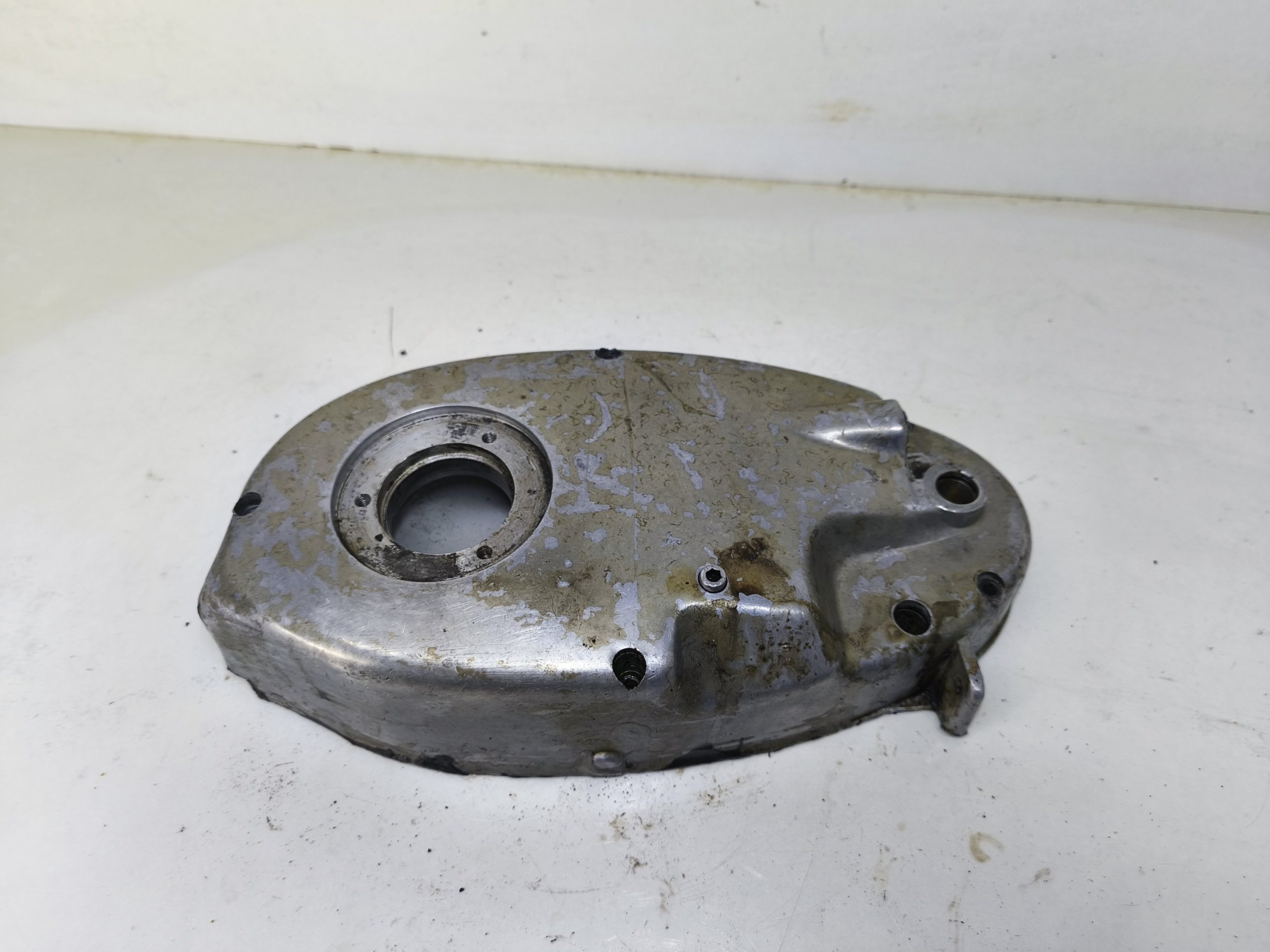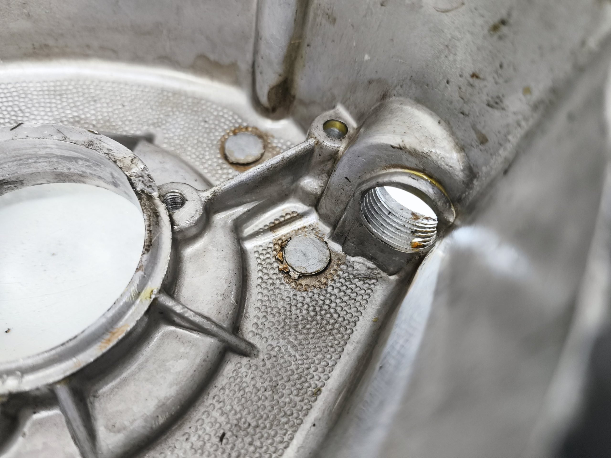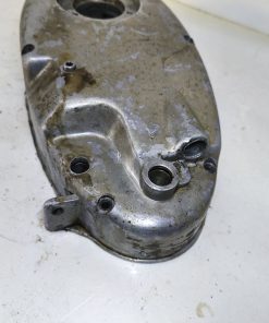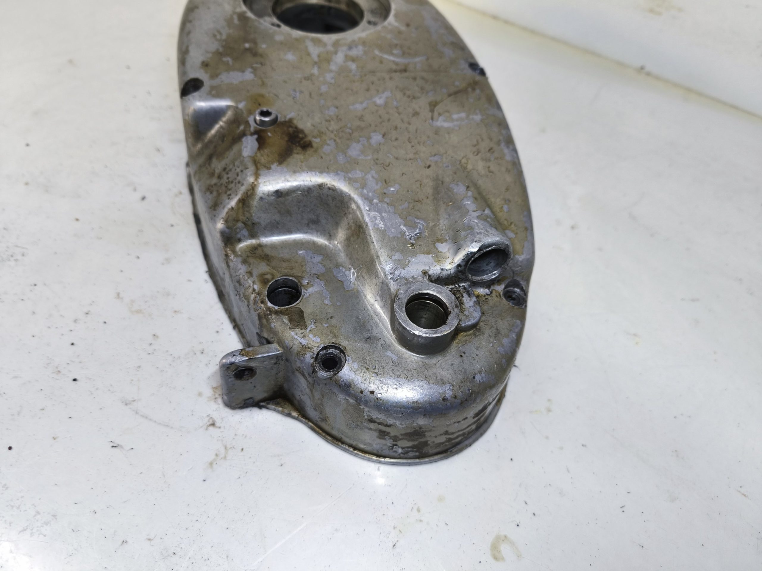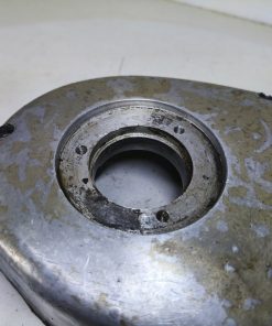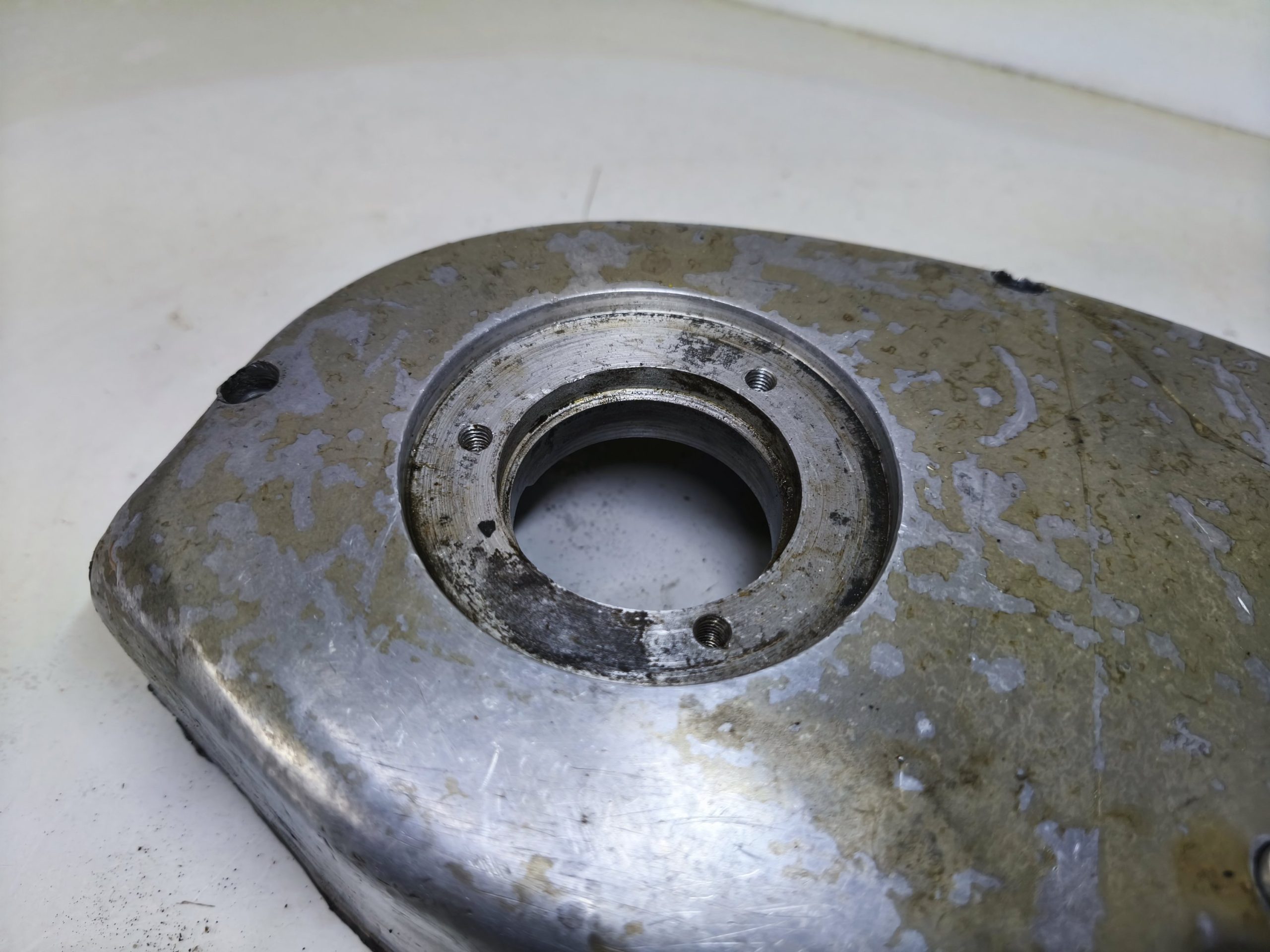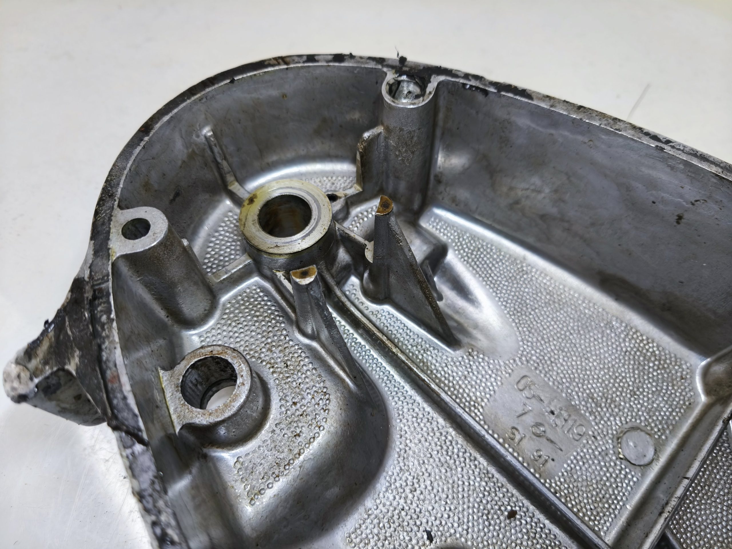 Pokrywa sprzęgła silnika MZ TS 250 250/1. Małe gwinty ok, gwint tulejki sprzęgła dobry. Pokrywa posiada kilka głębszych rys i otarć. Przylgnia nie jest idealna – posiada lekkie uchybienia.
