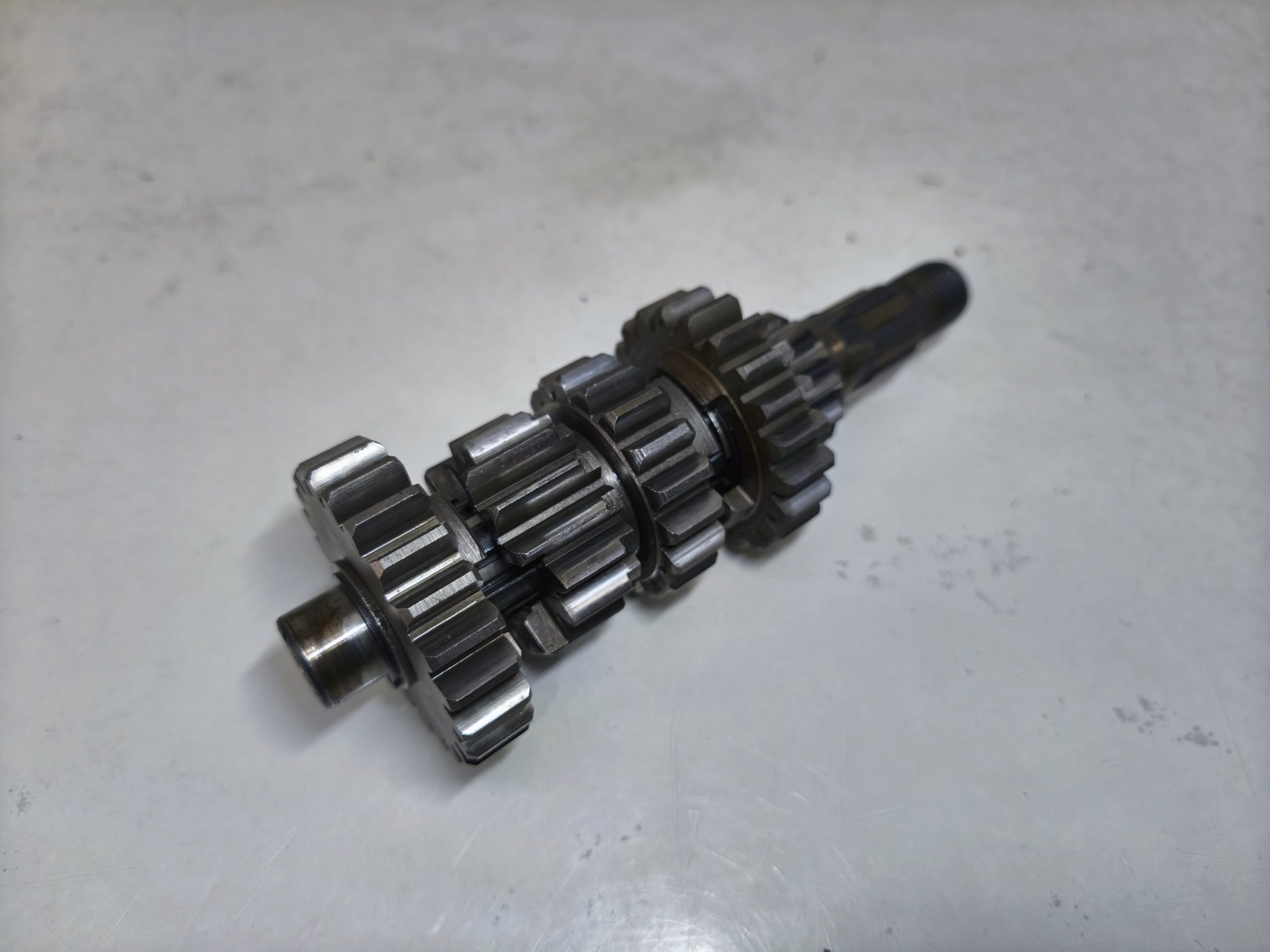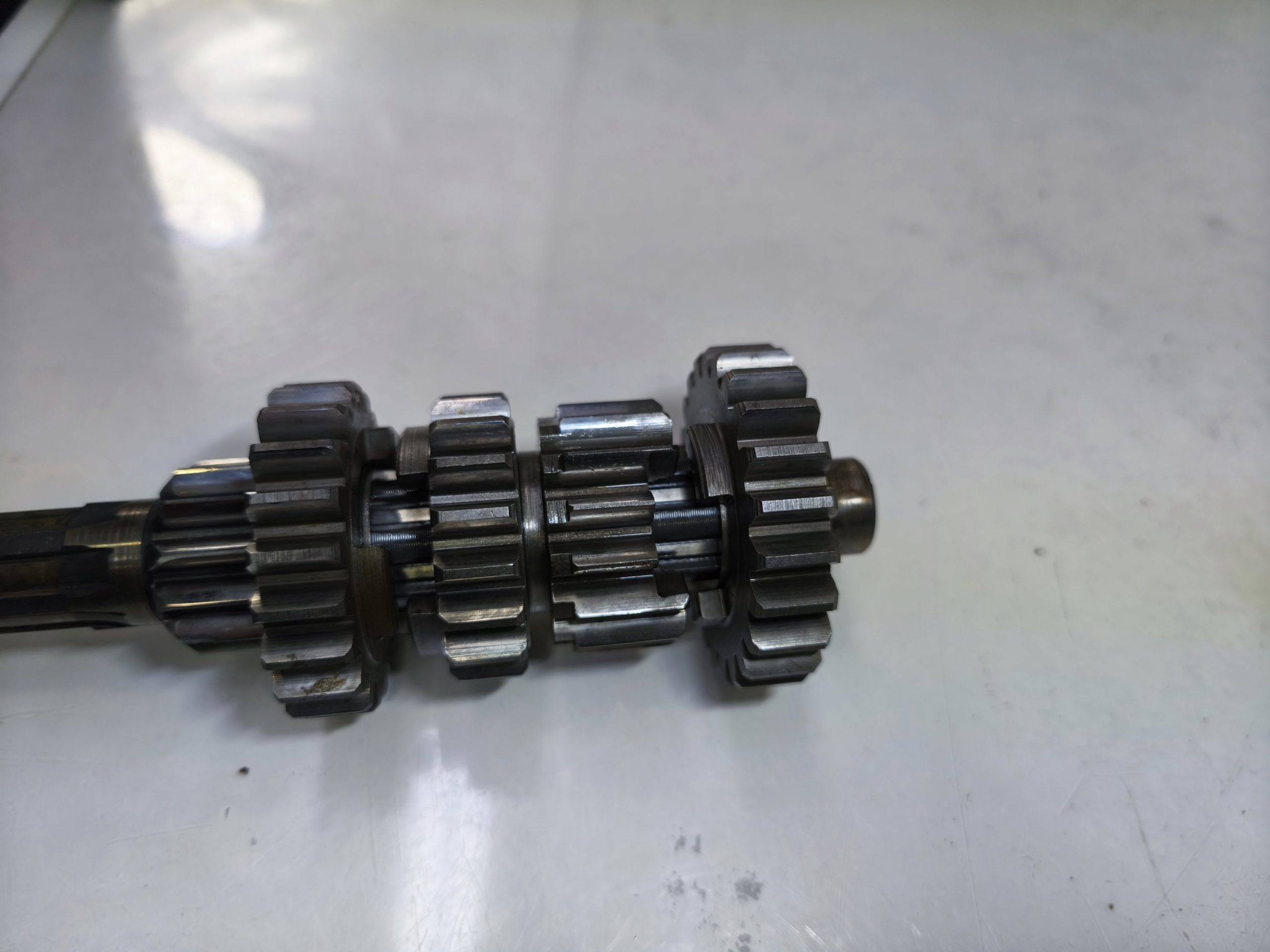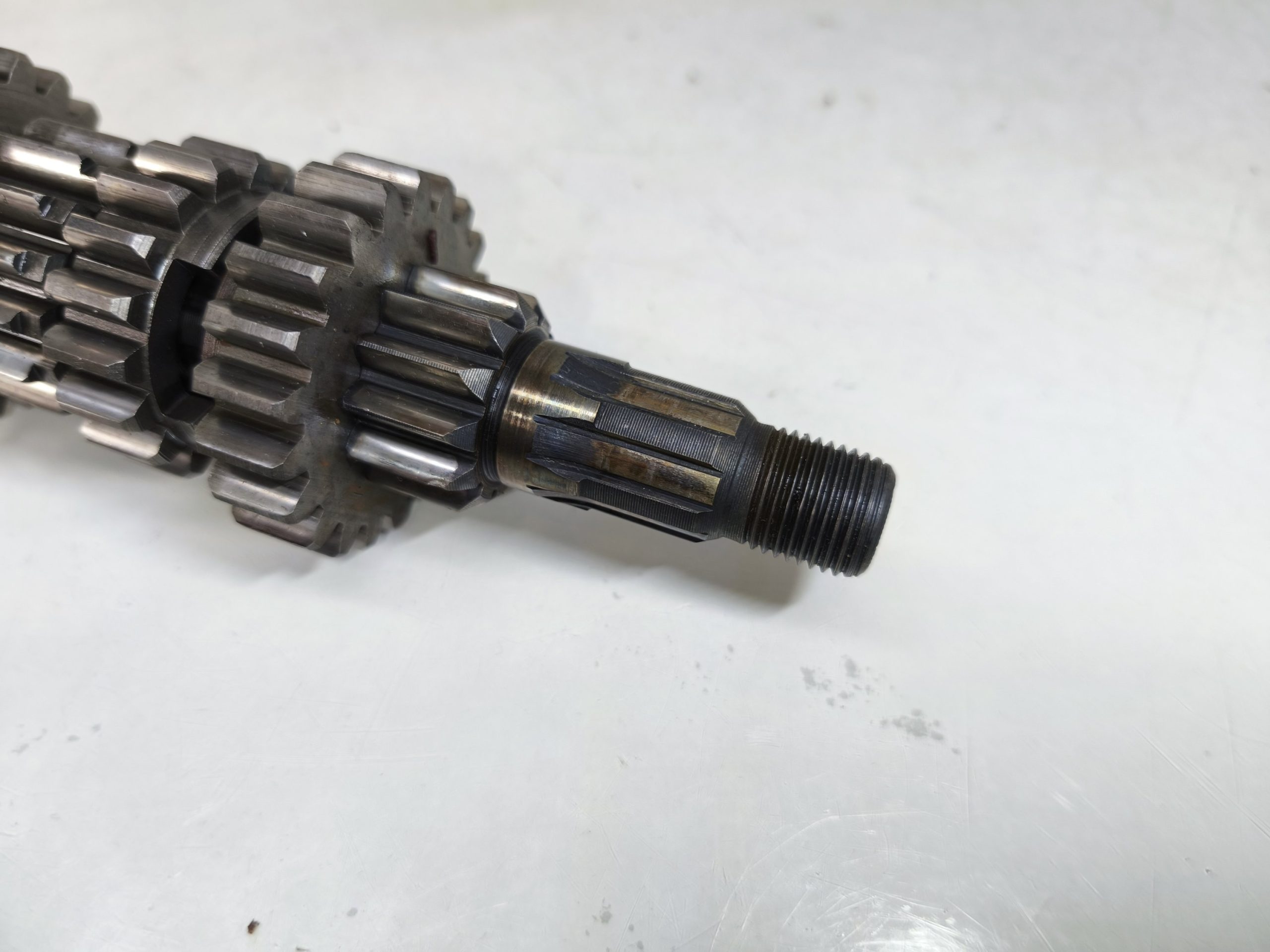 Skrzynia biegów – wałek sprzęgłowy MZ ETZ 250 251 301 TS 250/1. Na trybach zęby całe, frezy i gwint ok. Zęby kłowe w ładnym stanie. Delikatne uszczerbki zębach stałych wałka sprzęgłowego.