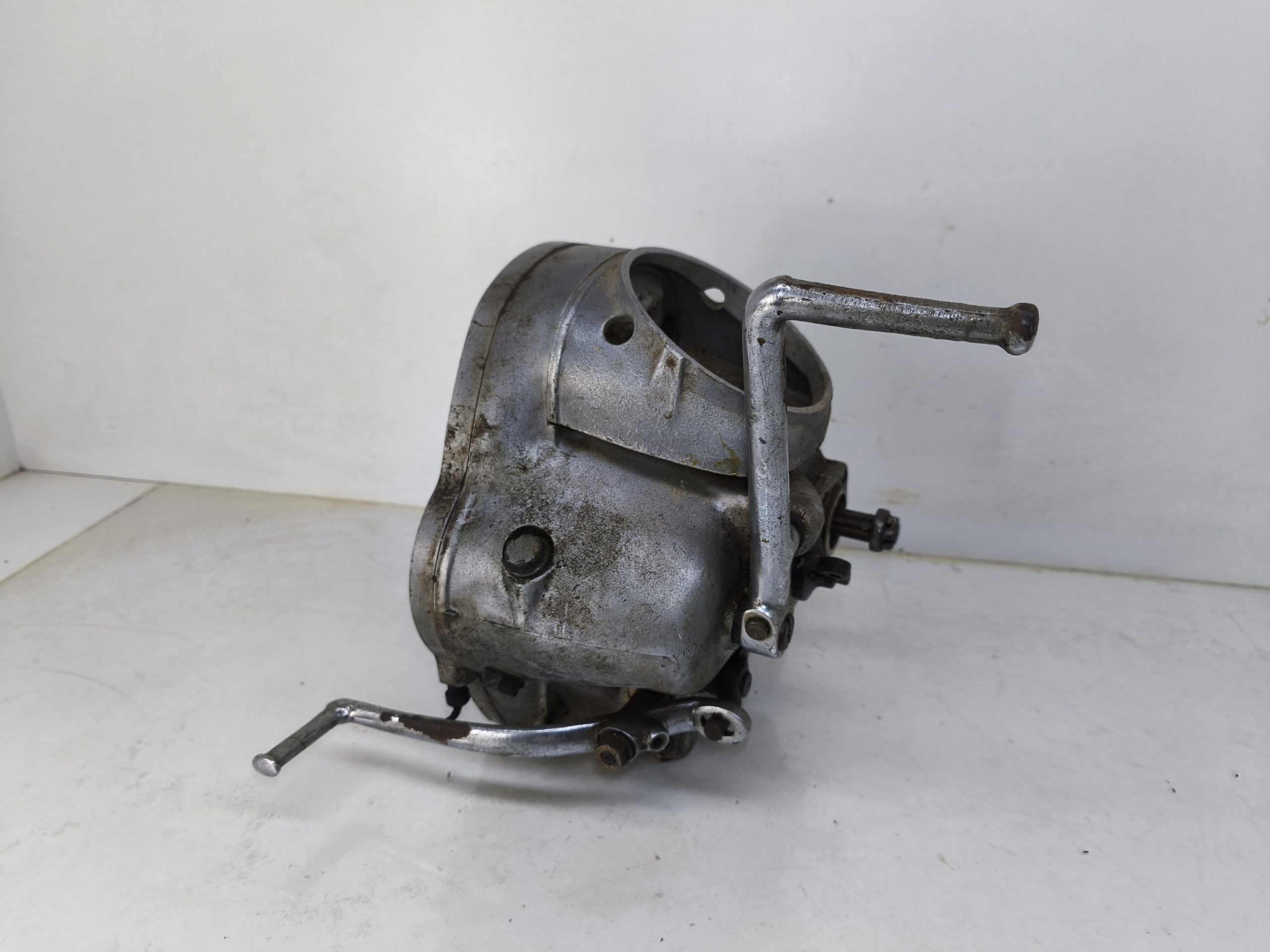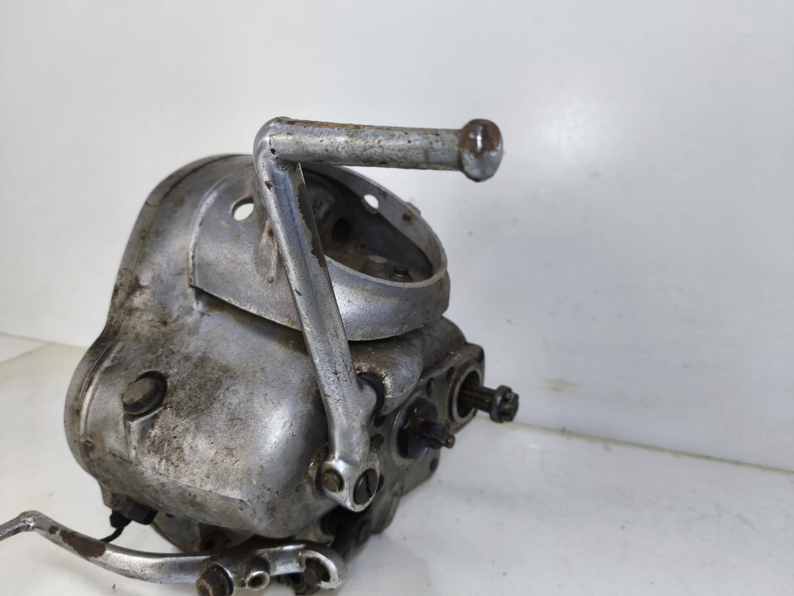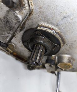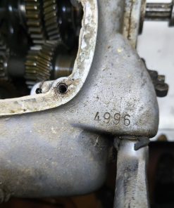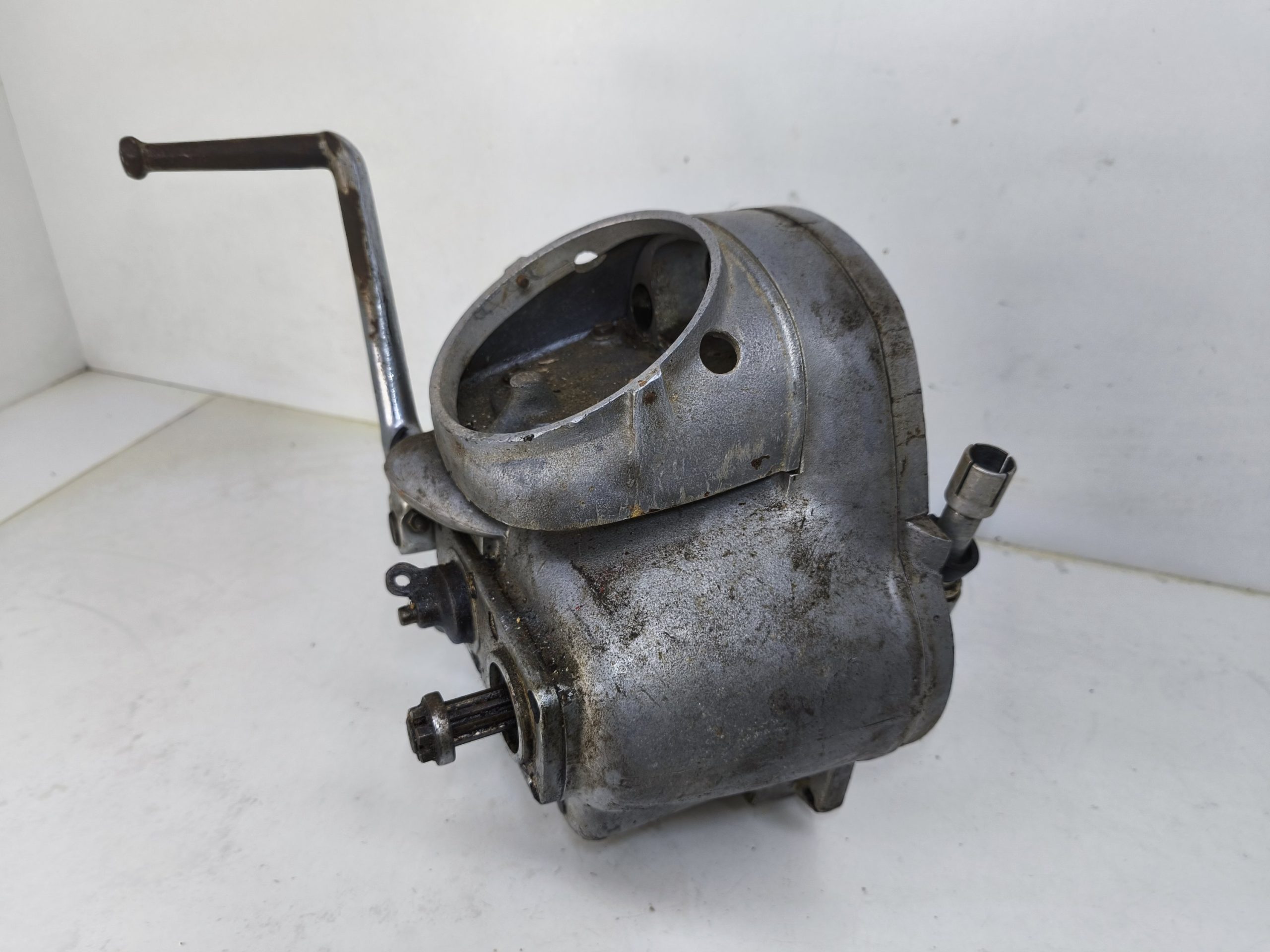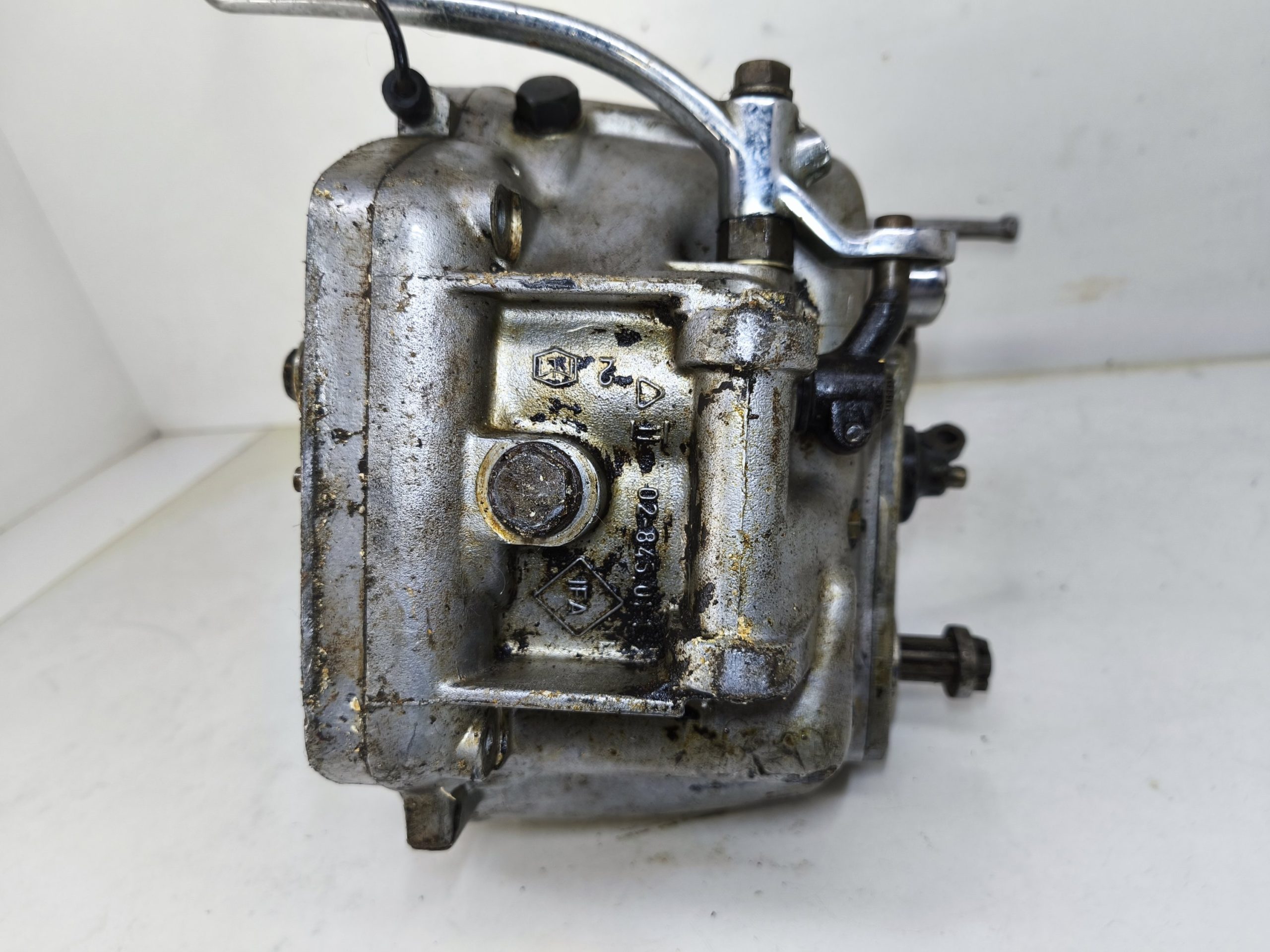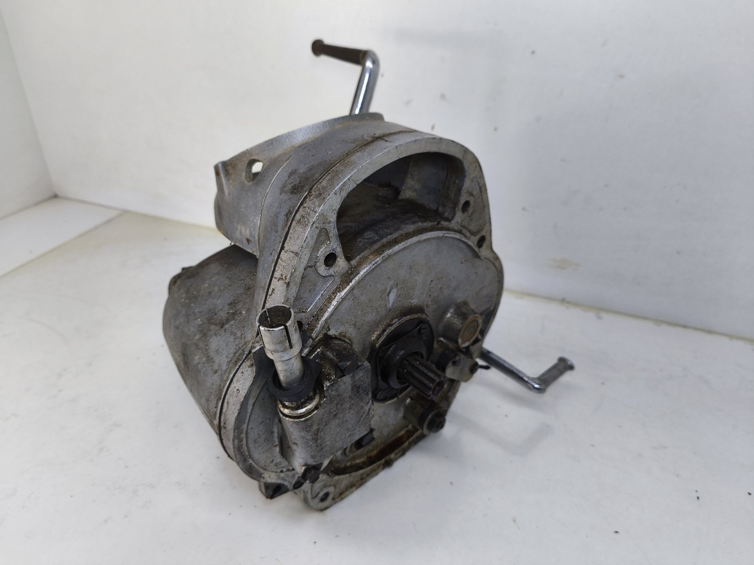 Skrzynia biegów MZ IFA BK 350. Skrzynia w ładnym stanie zachowania. Zewnętrznie kilka rys i otarć. Wałek startera działa, wałek zmiany biegów zmienia biegi lecz tylko w górę – nie działa zmiana biegów w dół. Wszelkie gwinty czy frezy wystające ze skrzynki w dość dobrym stanie. Po zdemontowaniu pokrywy rewizyjnej – wszystkie koła zębate wyglądały dość ładnie.