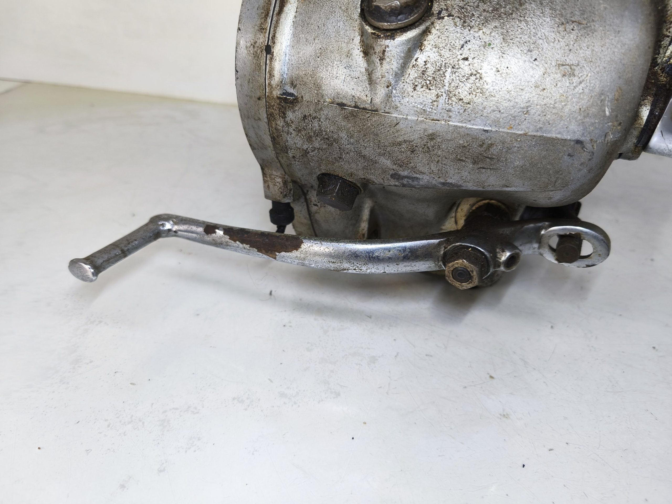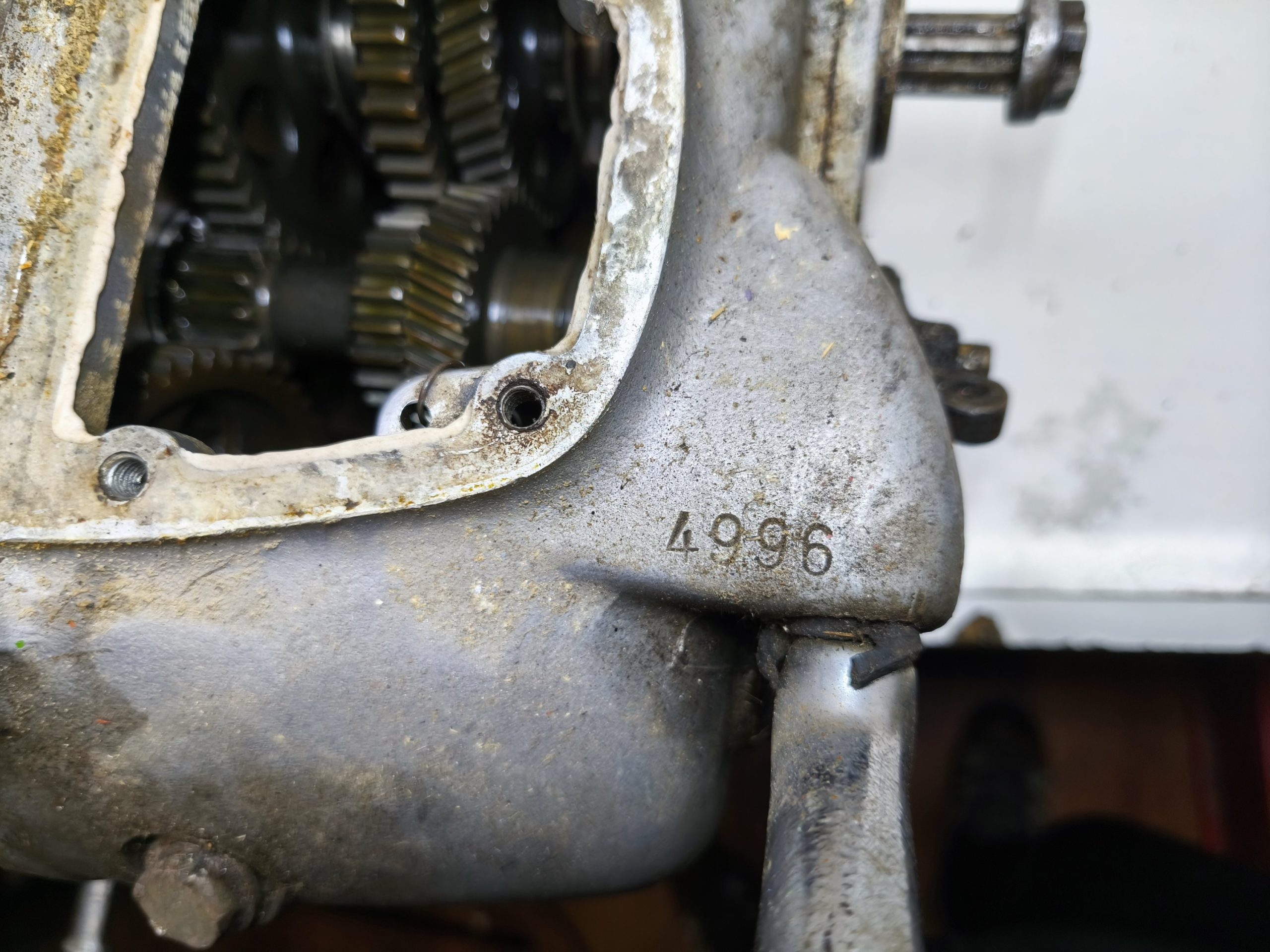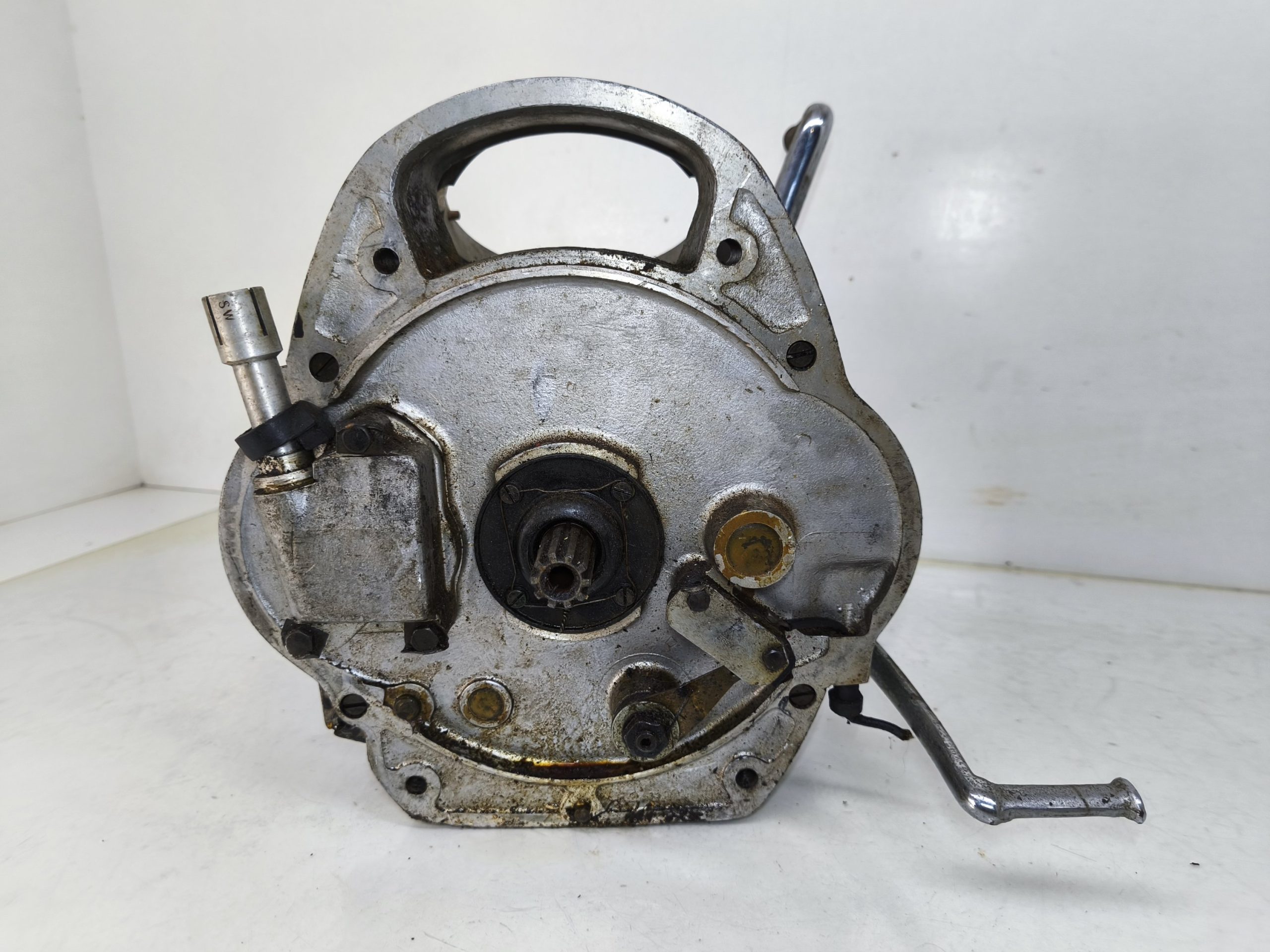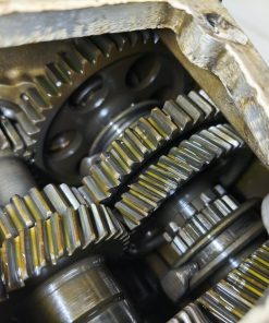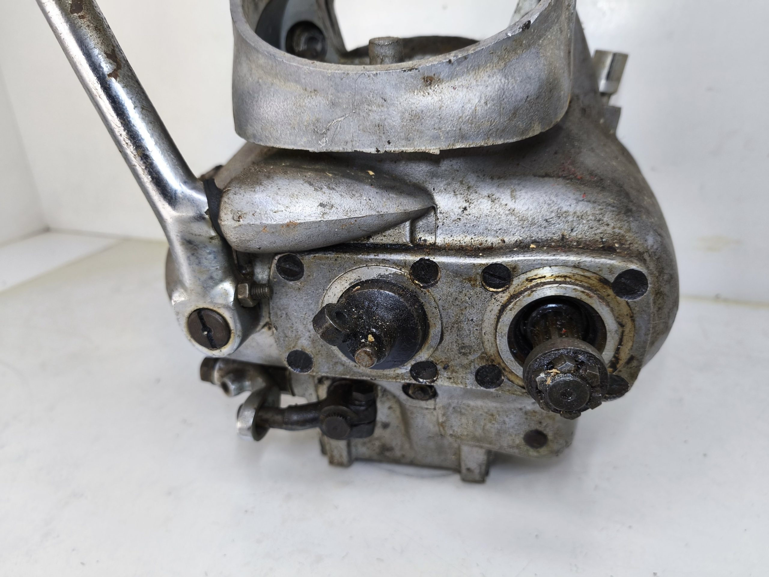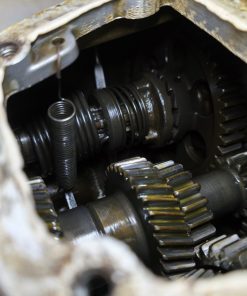 Skrzynia biegów MZ IFA BK 350. Skrzynia w ładnym stanie zachowania. Zewnętrznie kilka rys i otarć. Wałek startera działa, wałek zmiany biegów zmienia biegi lecz tylko w górę – nie działa zmiana biegów w dół. Wszelkie gwinty czy frezy wystające ze skrzynki w dość dobrym stanie. Po zdemontowaniu pokrywy rewizyjnej – wszystkie koła zębate wyglądały dość ładnie.