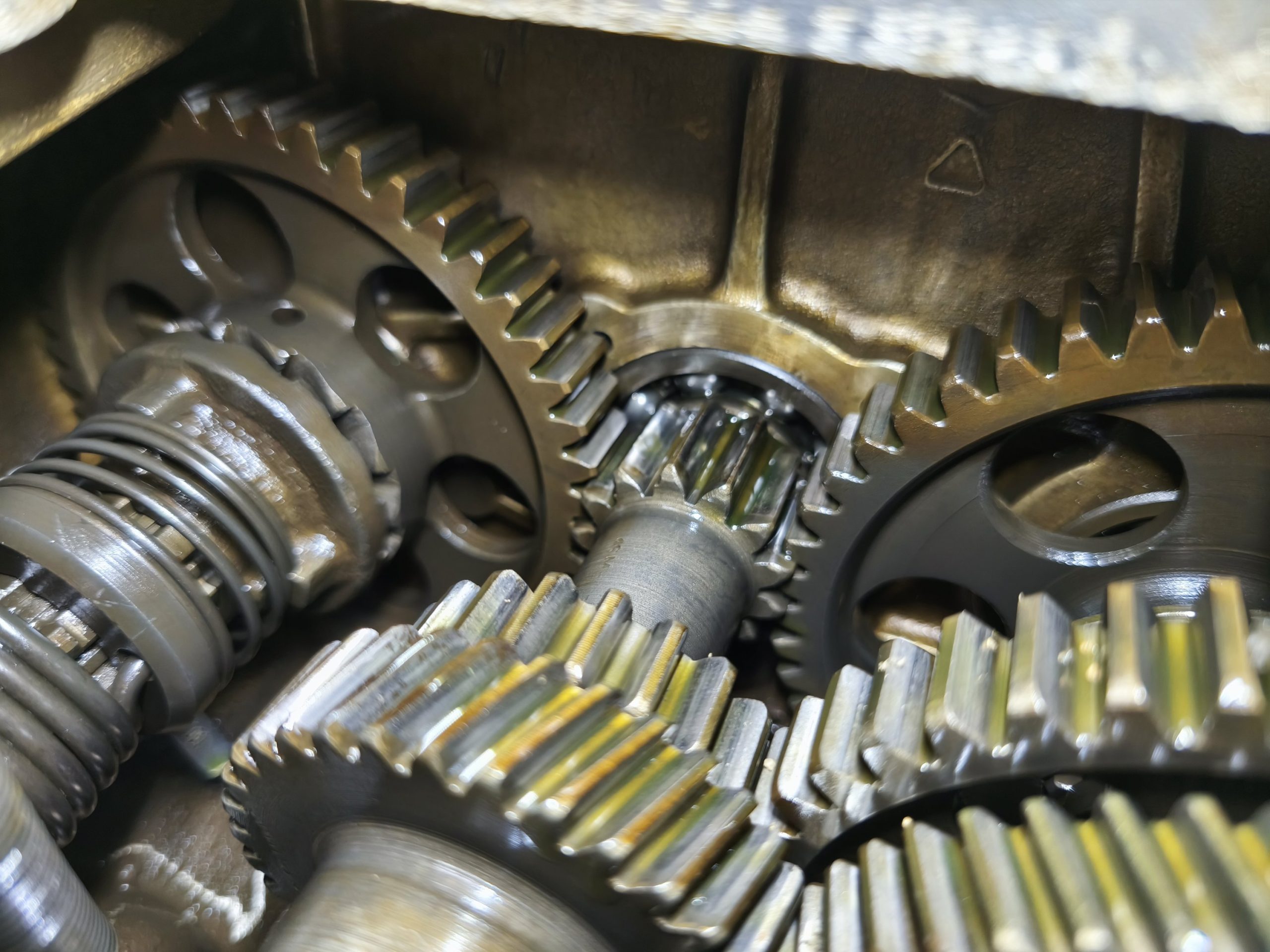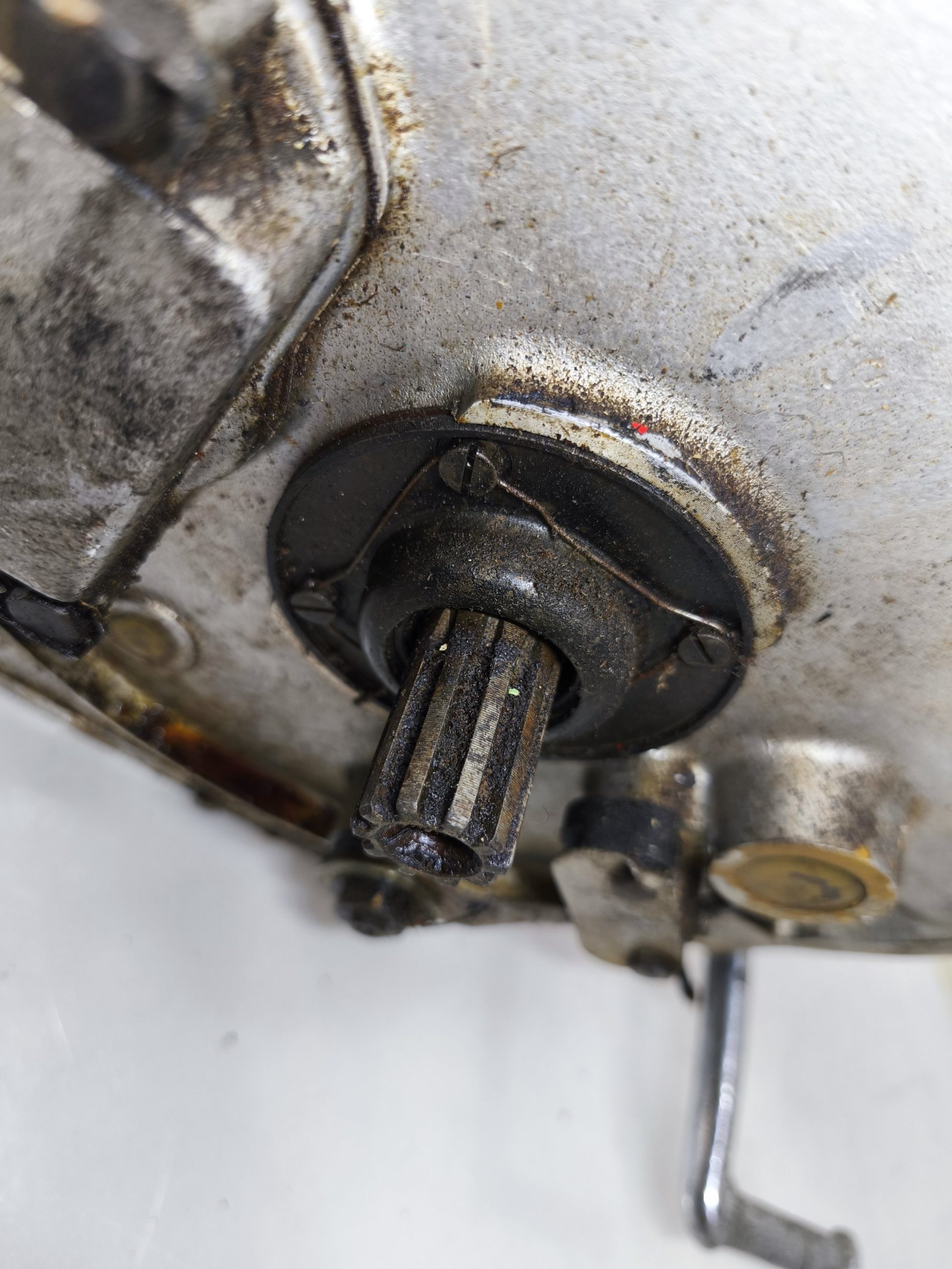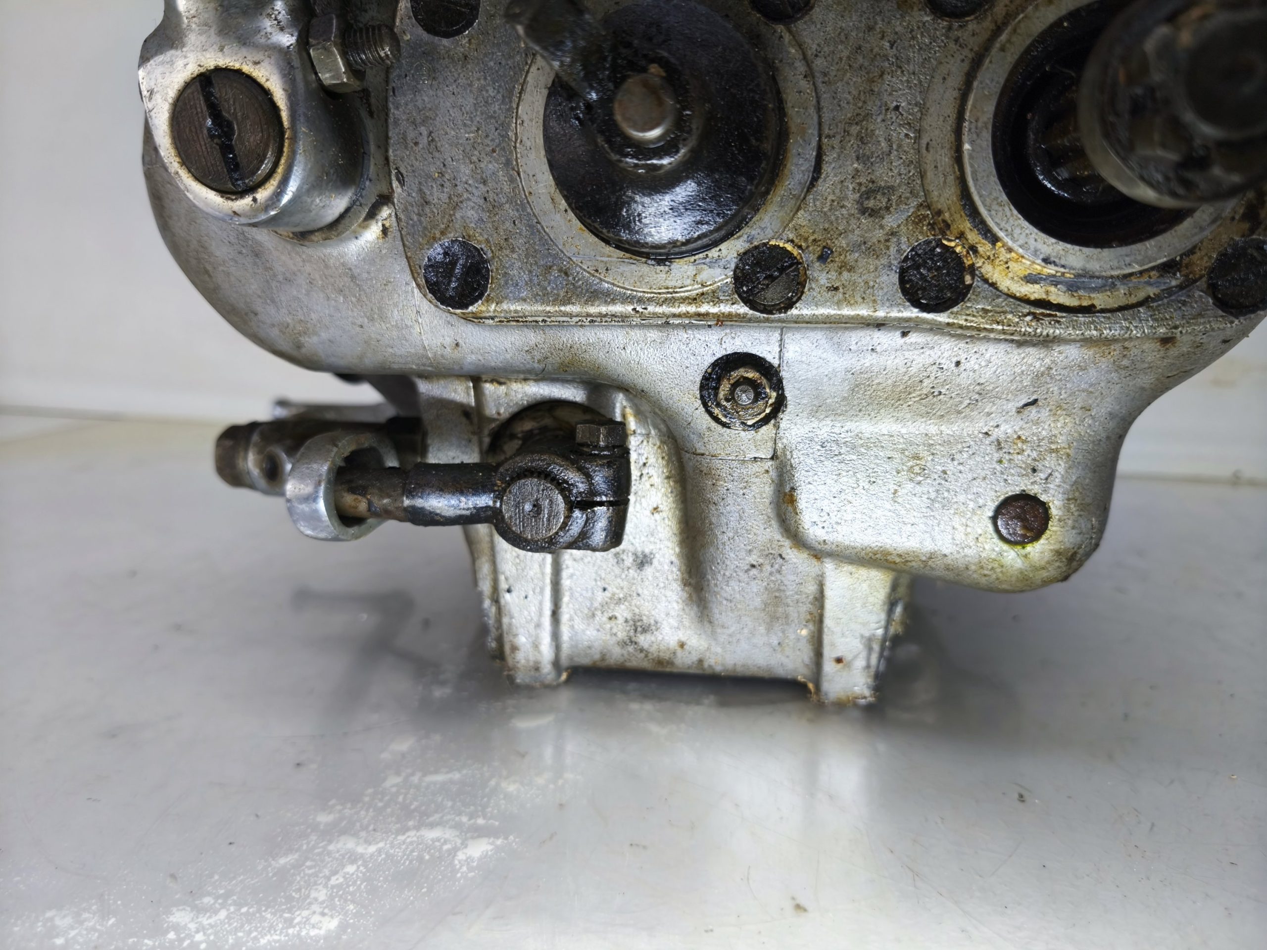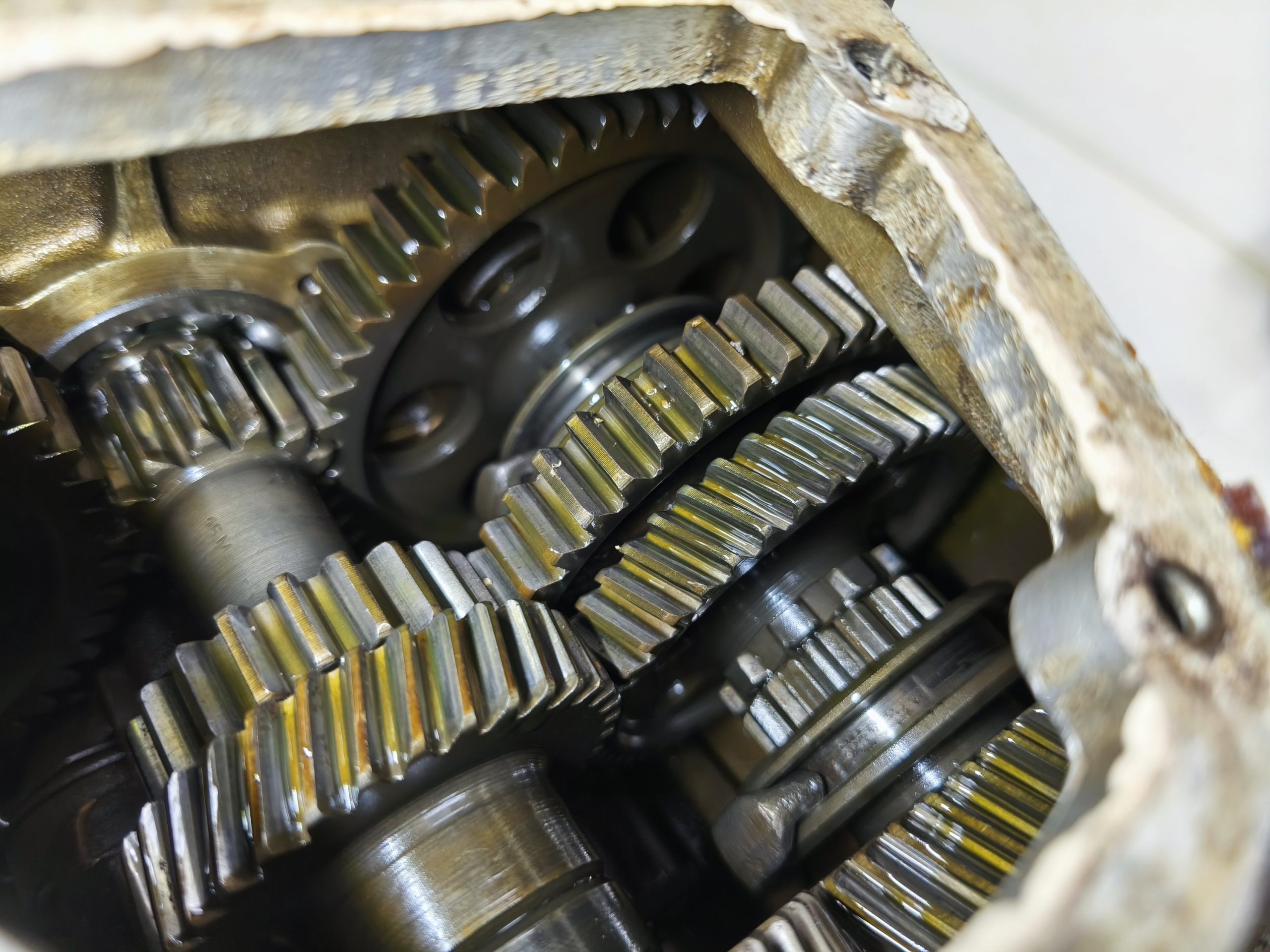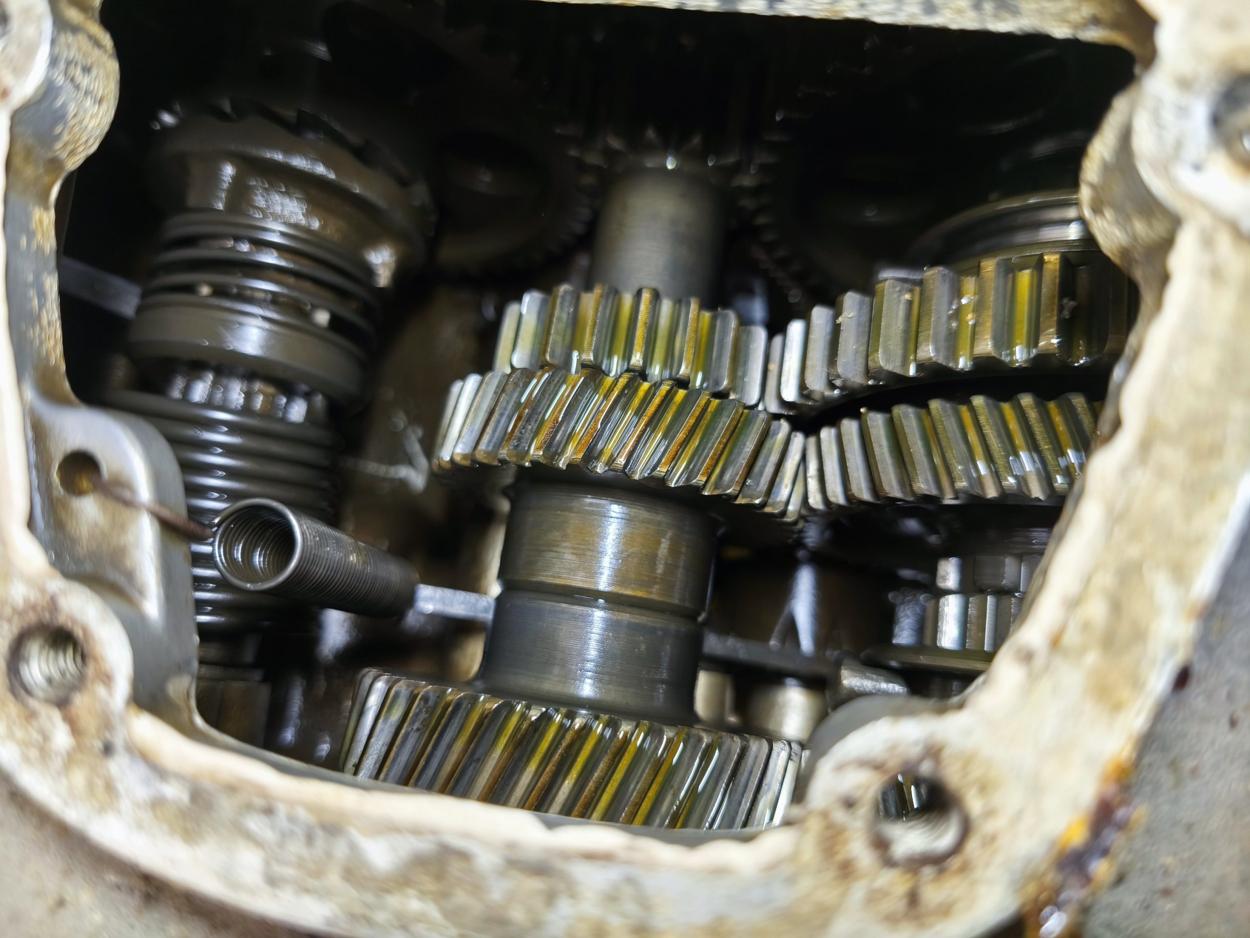 Skrzynia biegów MZ IFA BK 350. Skrzynia w ładnym stanie zachowania. Zewnętrznie kilka rys i otarć. Wałek startera działa, wałek zmiany biegów zmienia biegi lecz tylko w górę – nie działa zmiana biegów w dół. Wszelkie gwinty czy frezy wystające ze skrzynki w dość dobrym stanie. Po zdemontowaniu pokrywy rewizyjnej – wszystkie koła zębate wyglądały dość ładnie.