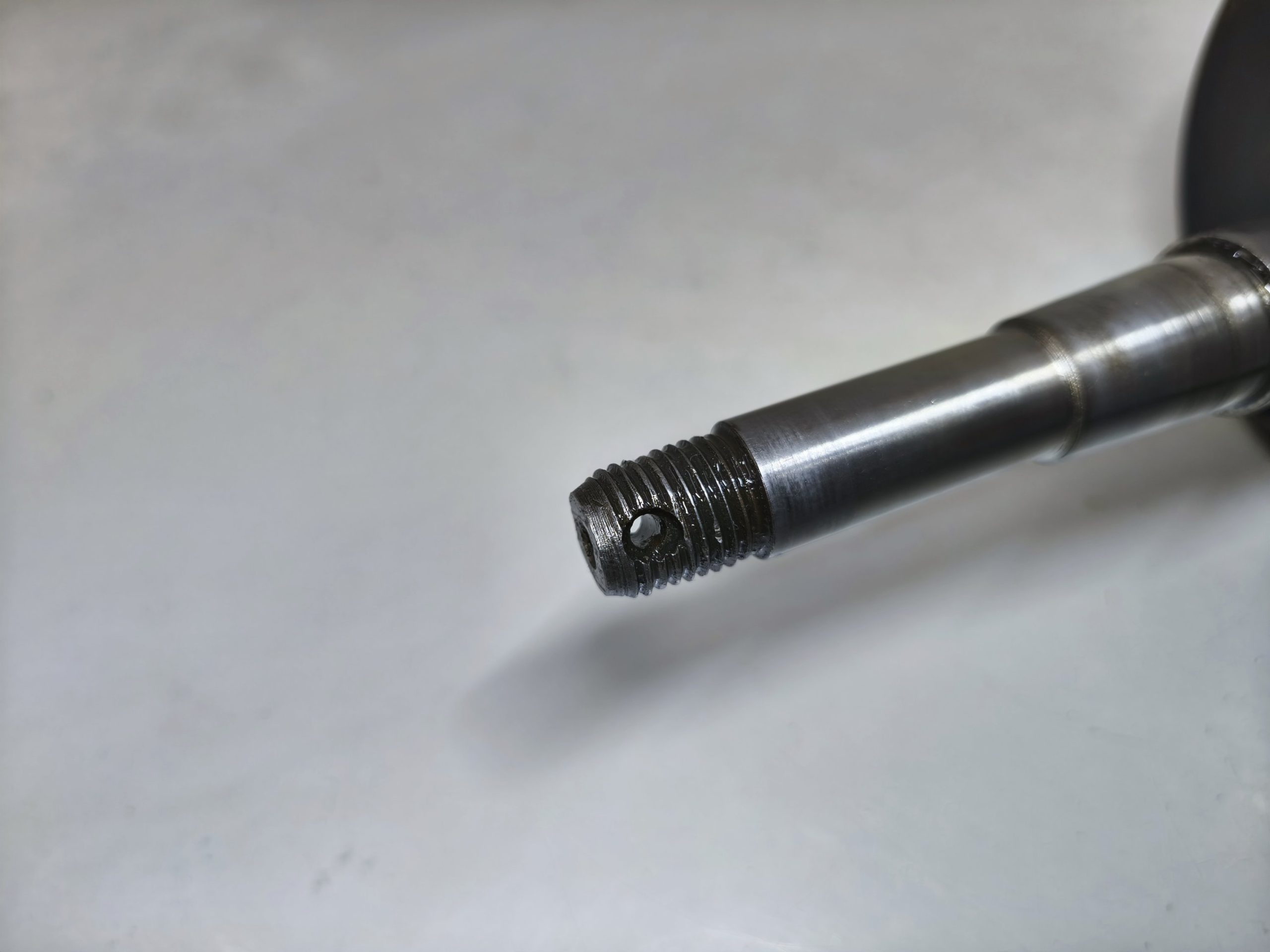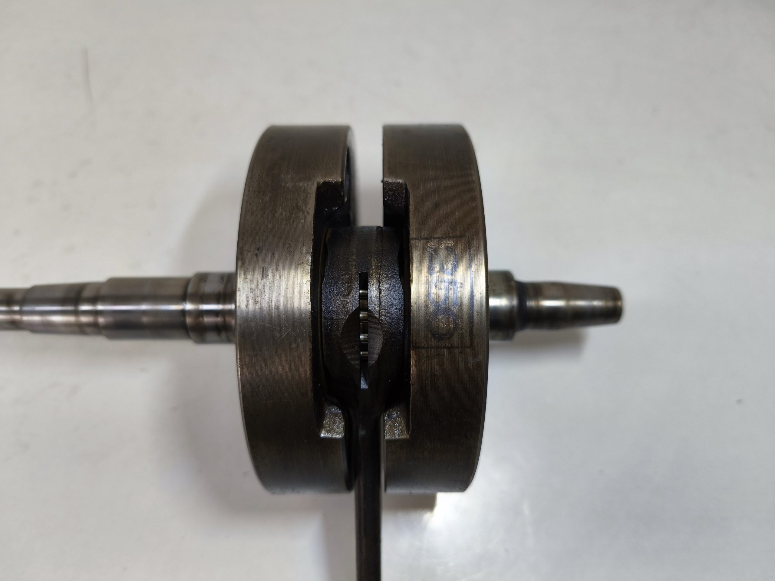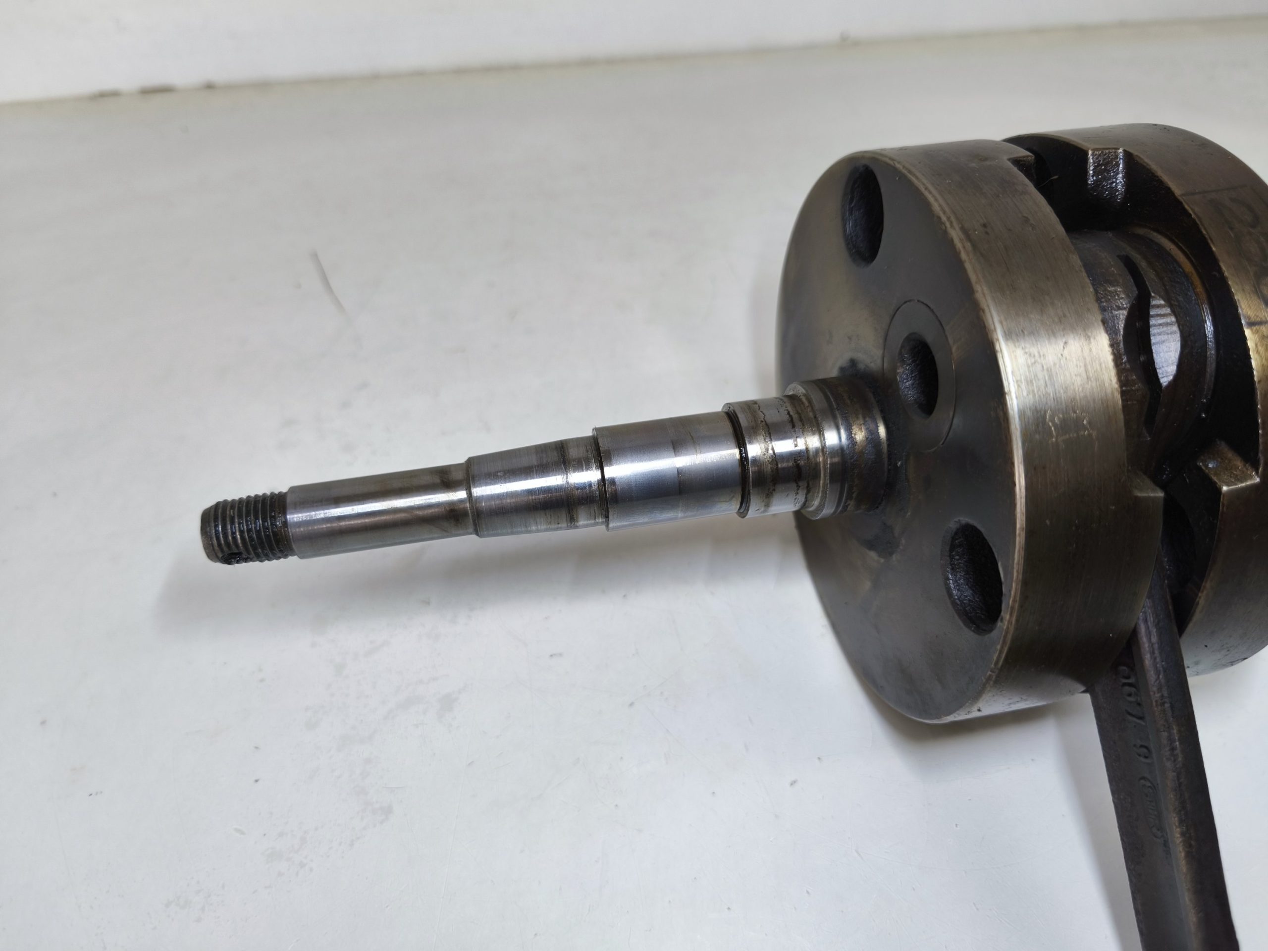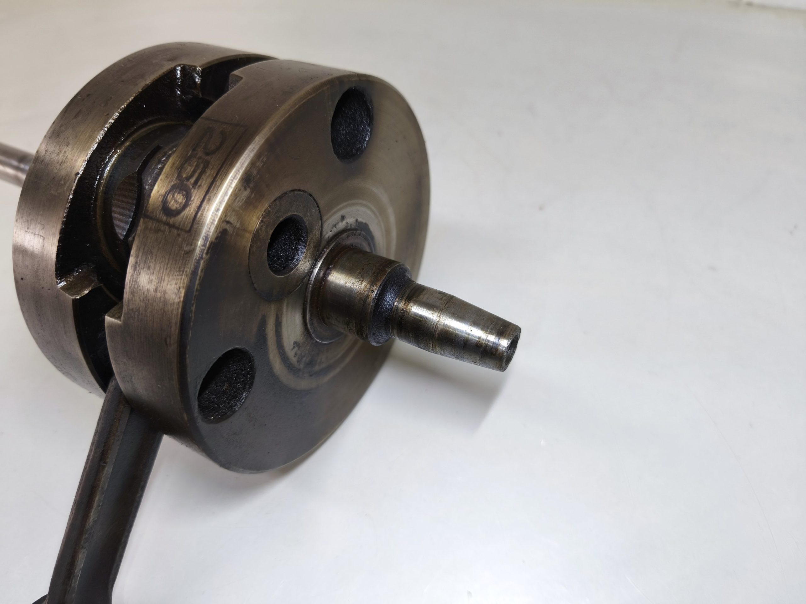 Wał korbowy silnika MZ ES 250 Jaskółka Zerówka. Gwinty ok. Sprzęgło siedziało ładnie na stożku. Duży ruch korby na boki – do regeneracji. Oryginalne oznaczenia IFA.