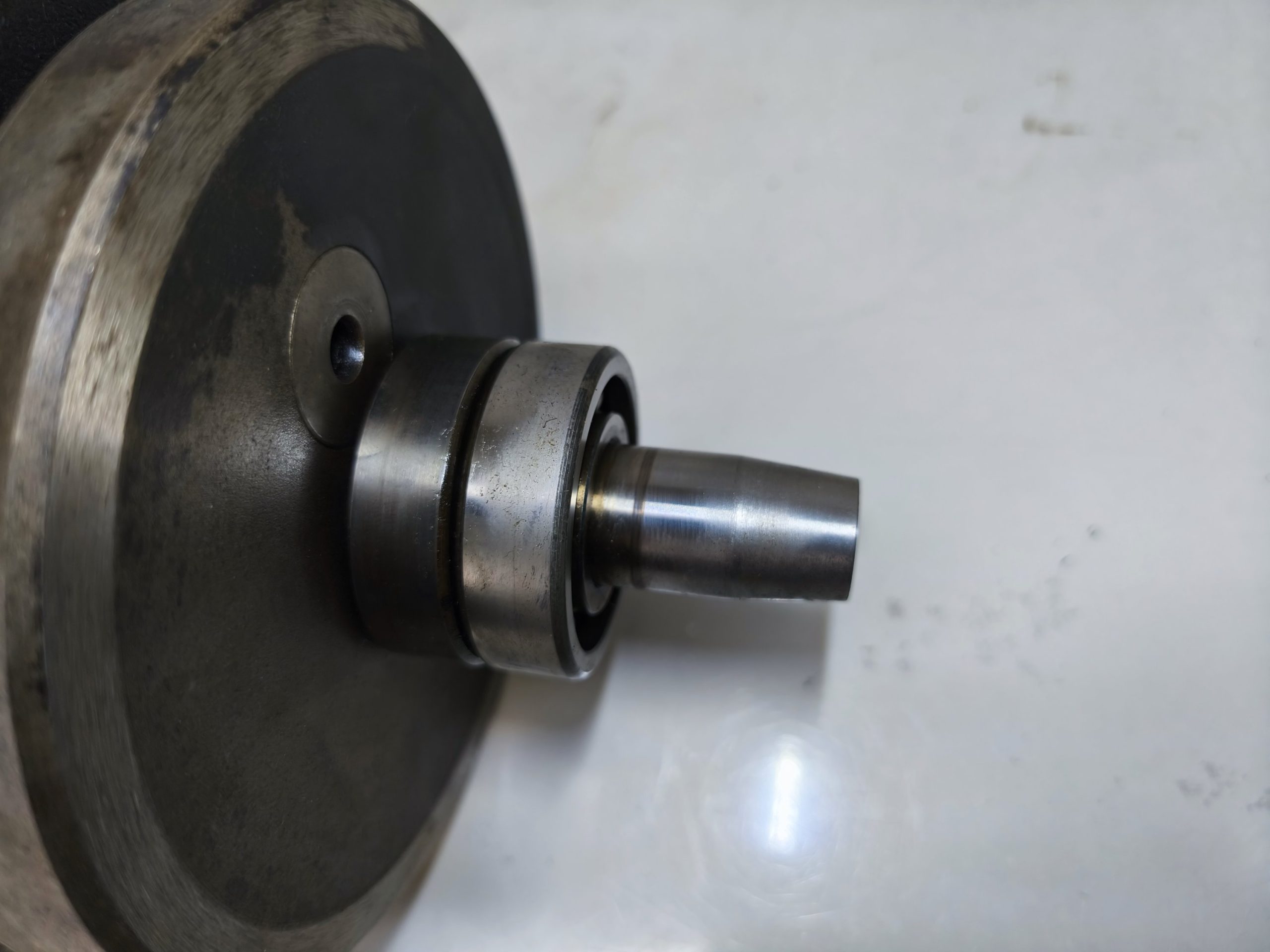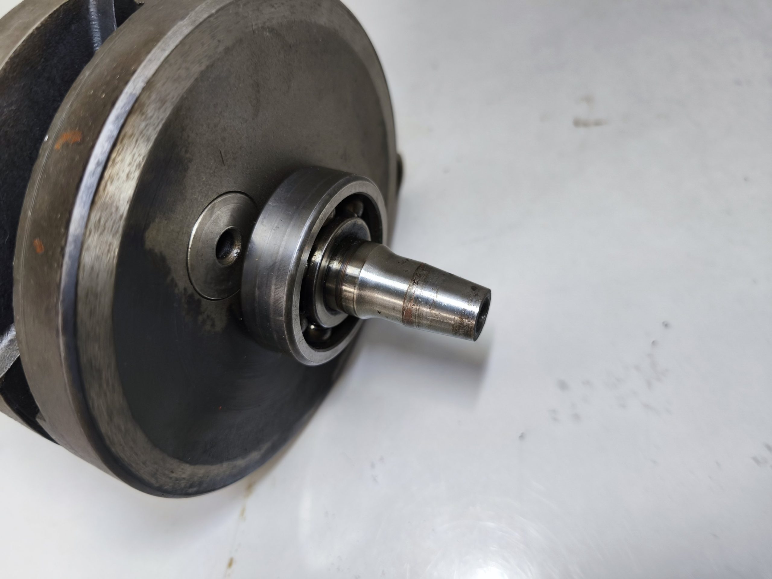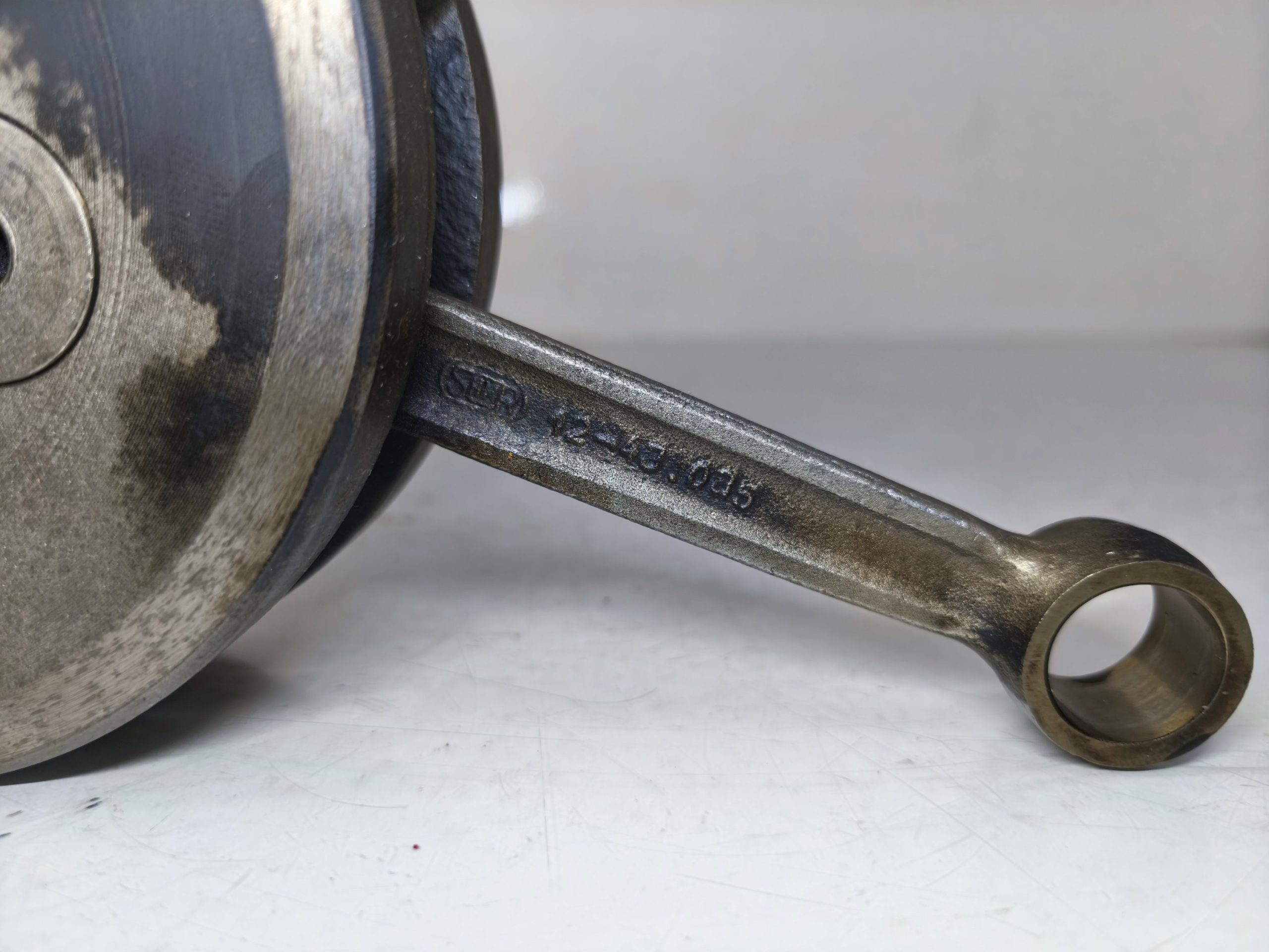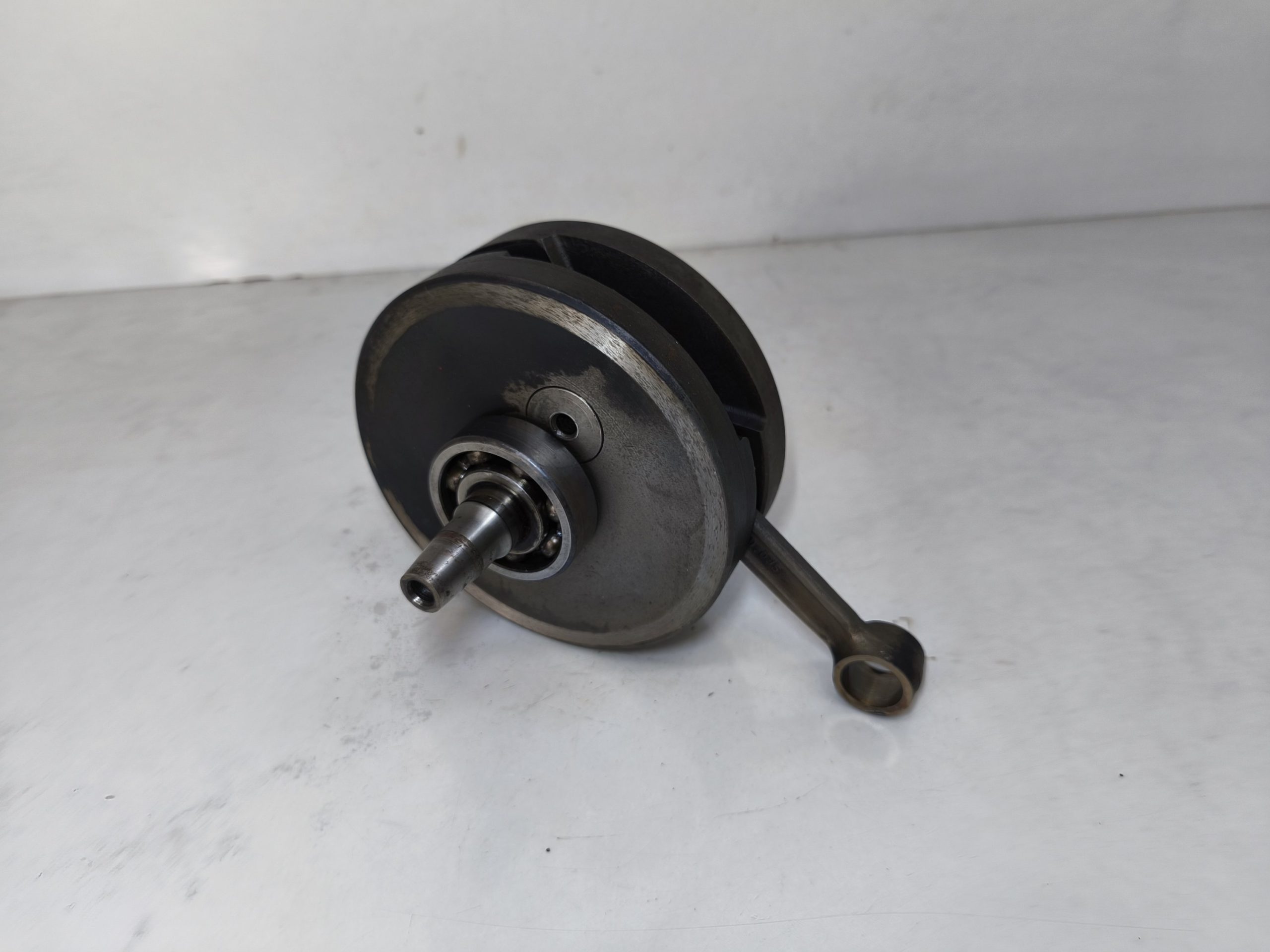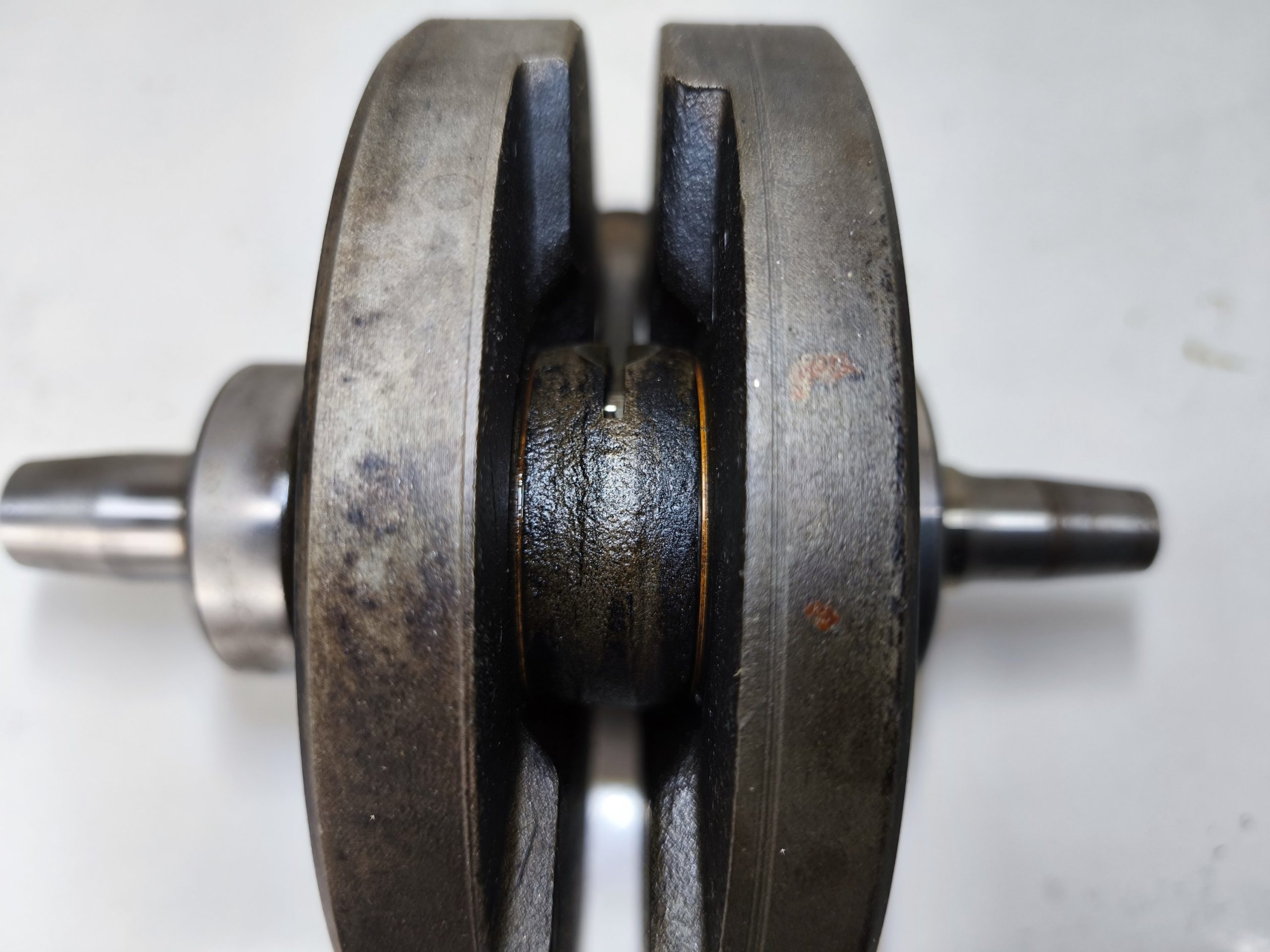 Wał korbowy silnika MZ TS 125 150. Stan do regeneracji, gwinty ok. Wyczuwalny ruch korby na boki, korba oryginał – do regeneracji.