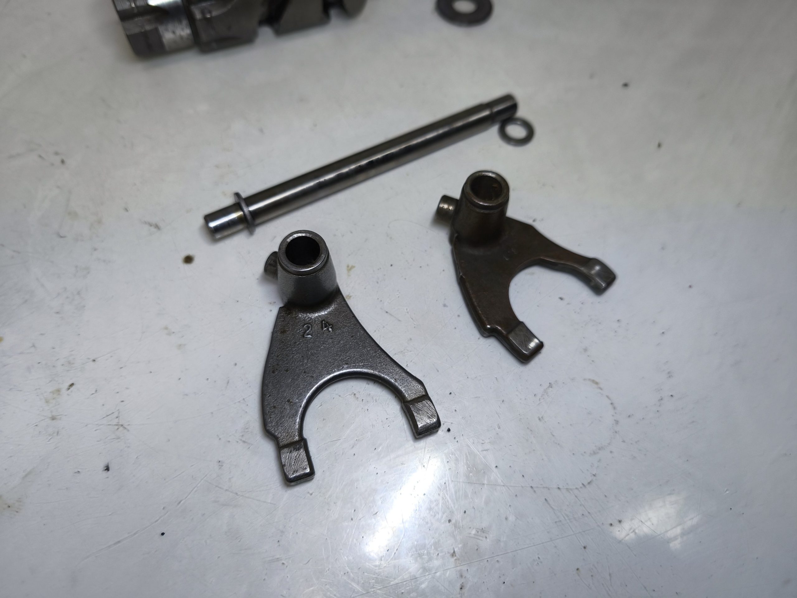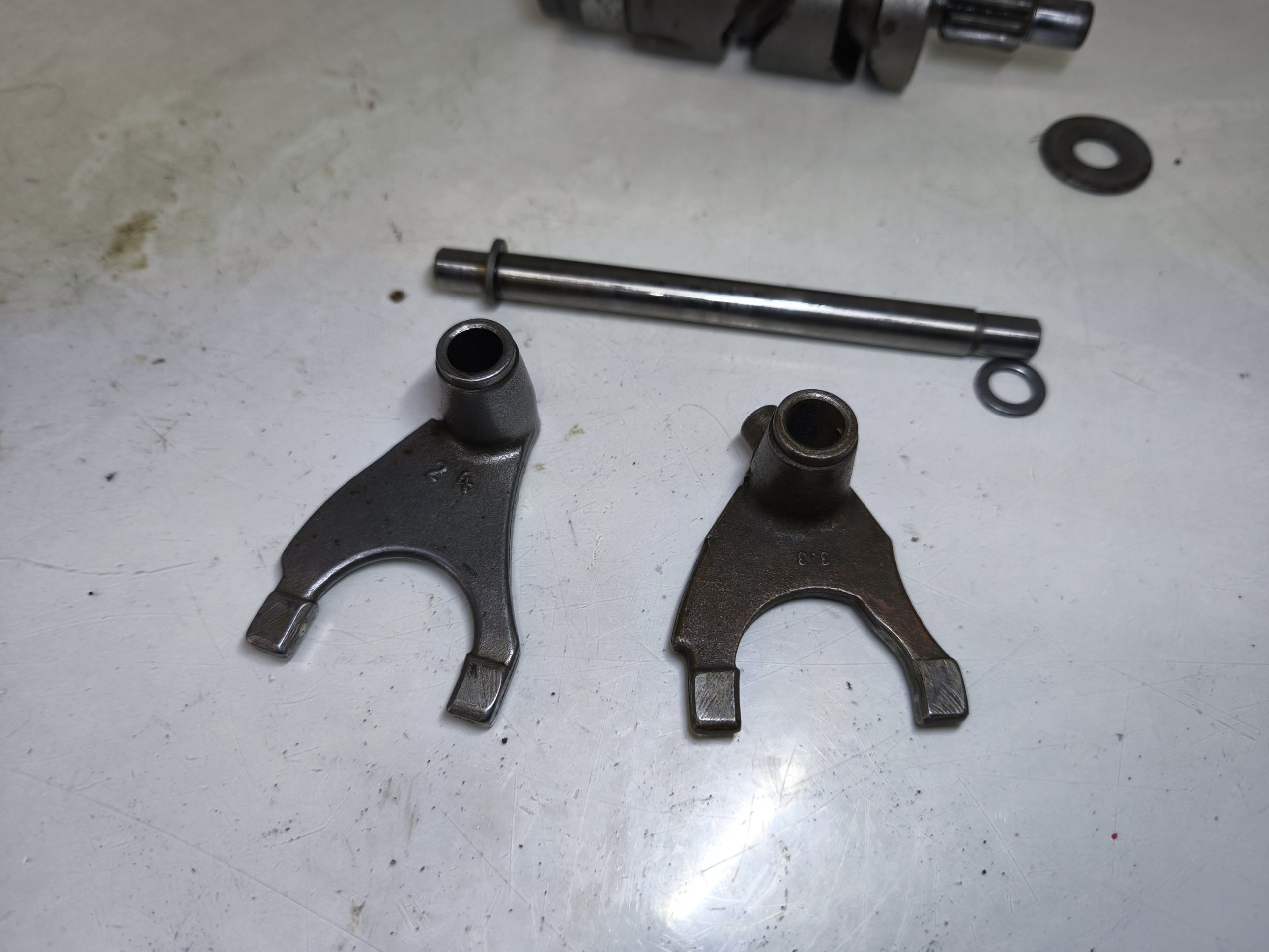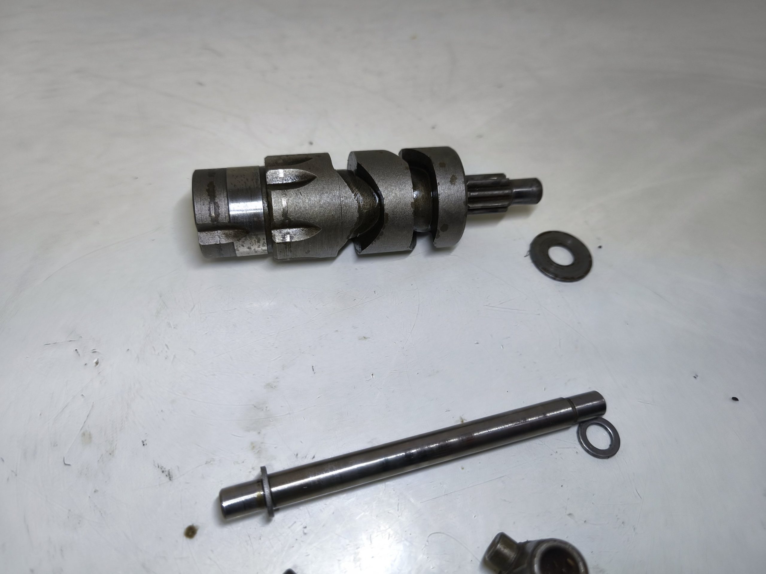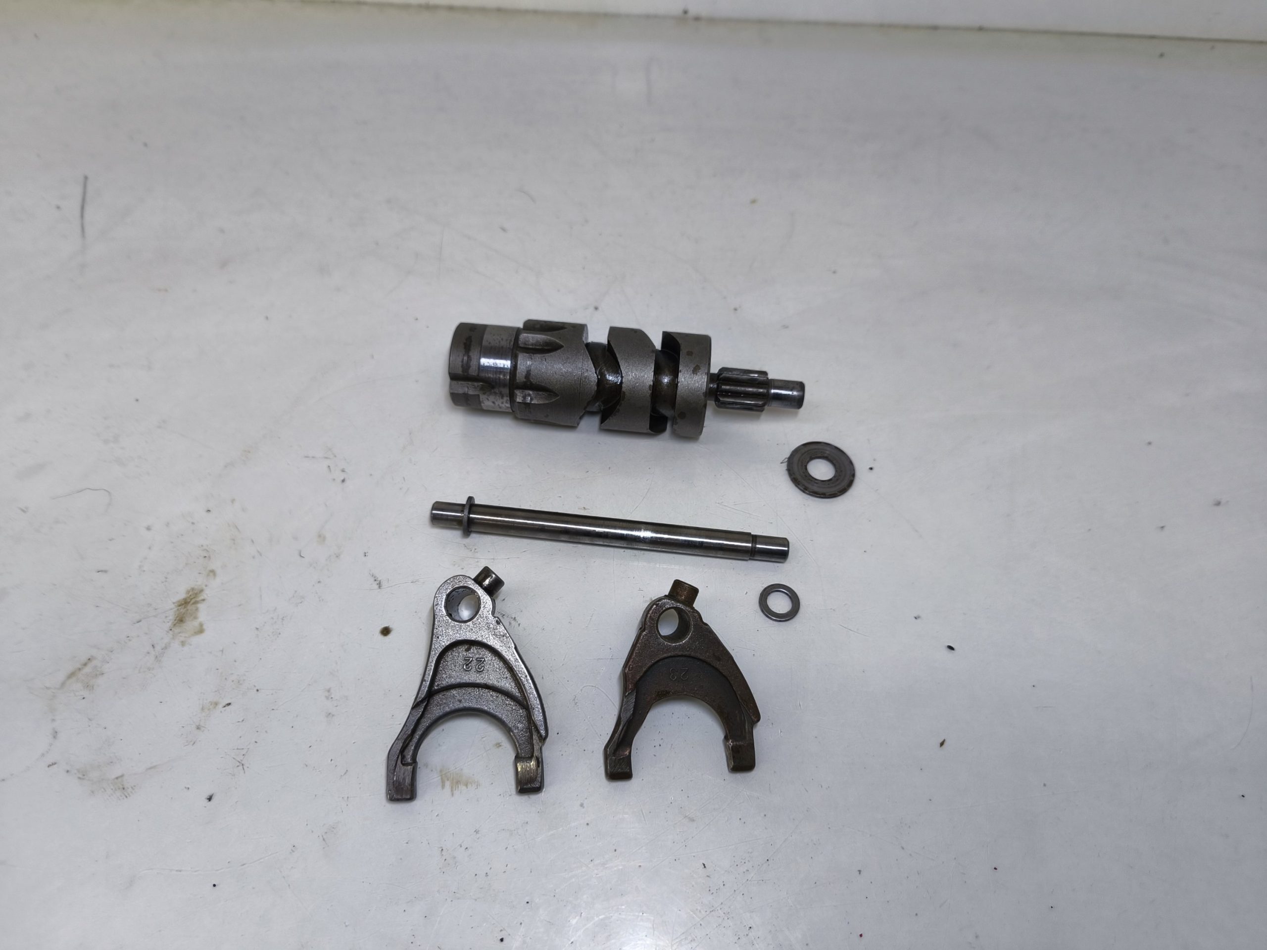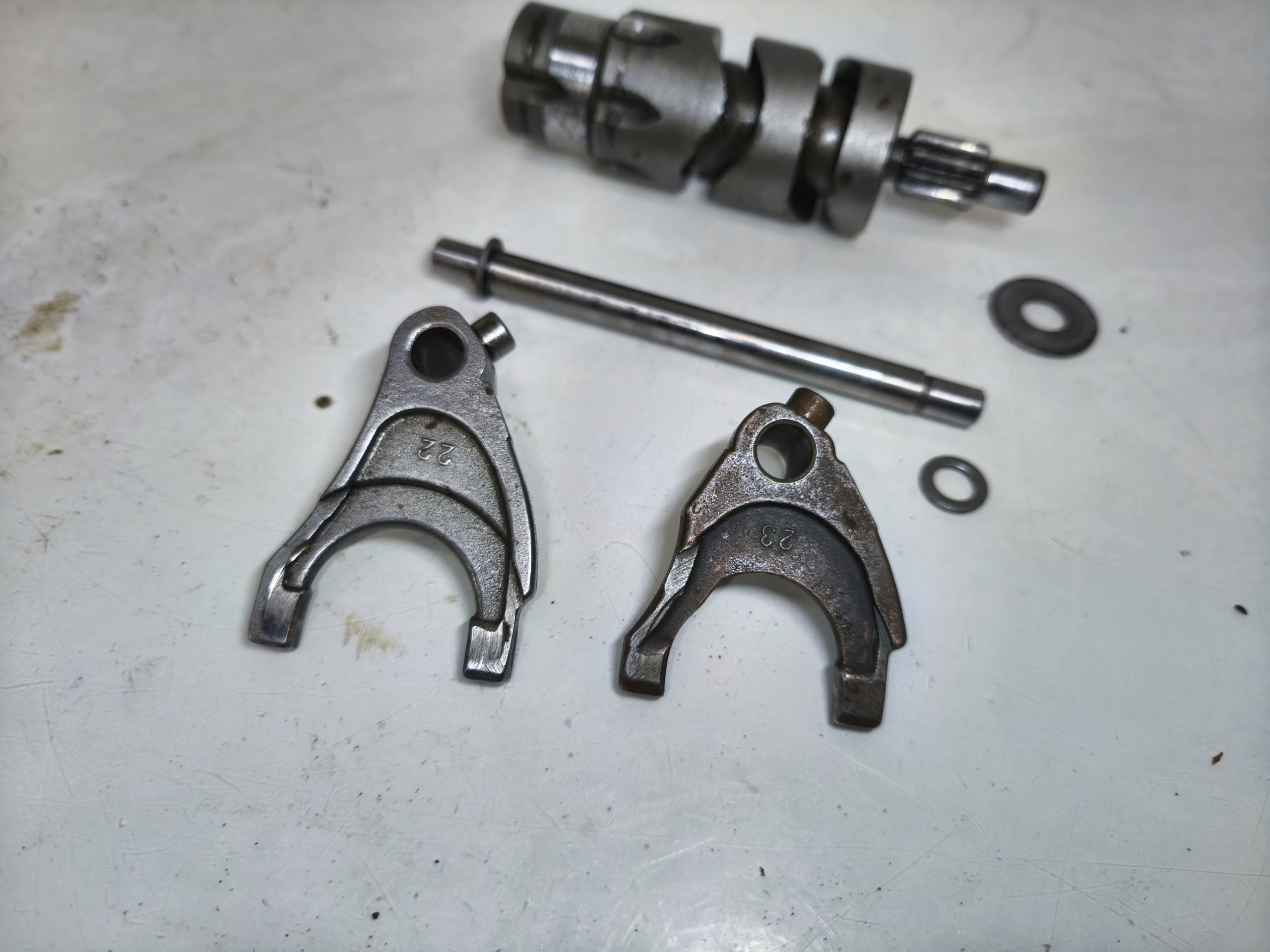 Wodziki skrzyni biegów MZ ES 250/1 Jaskółka z wałkiem krzywkowym. Wodziki w niezłej kondycji, lekkie ślady zużycia.