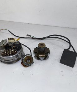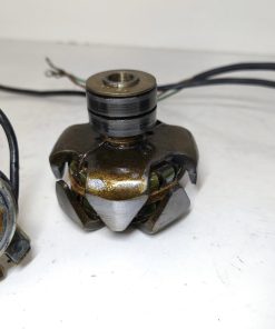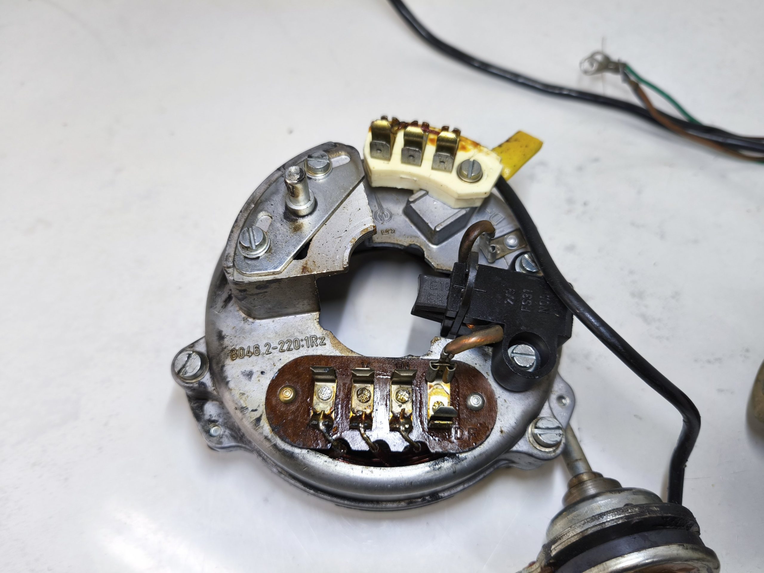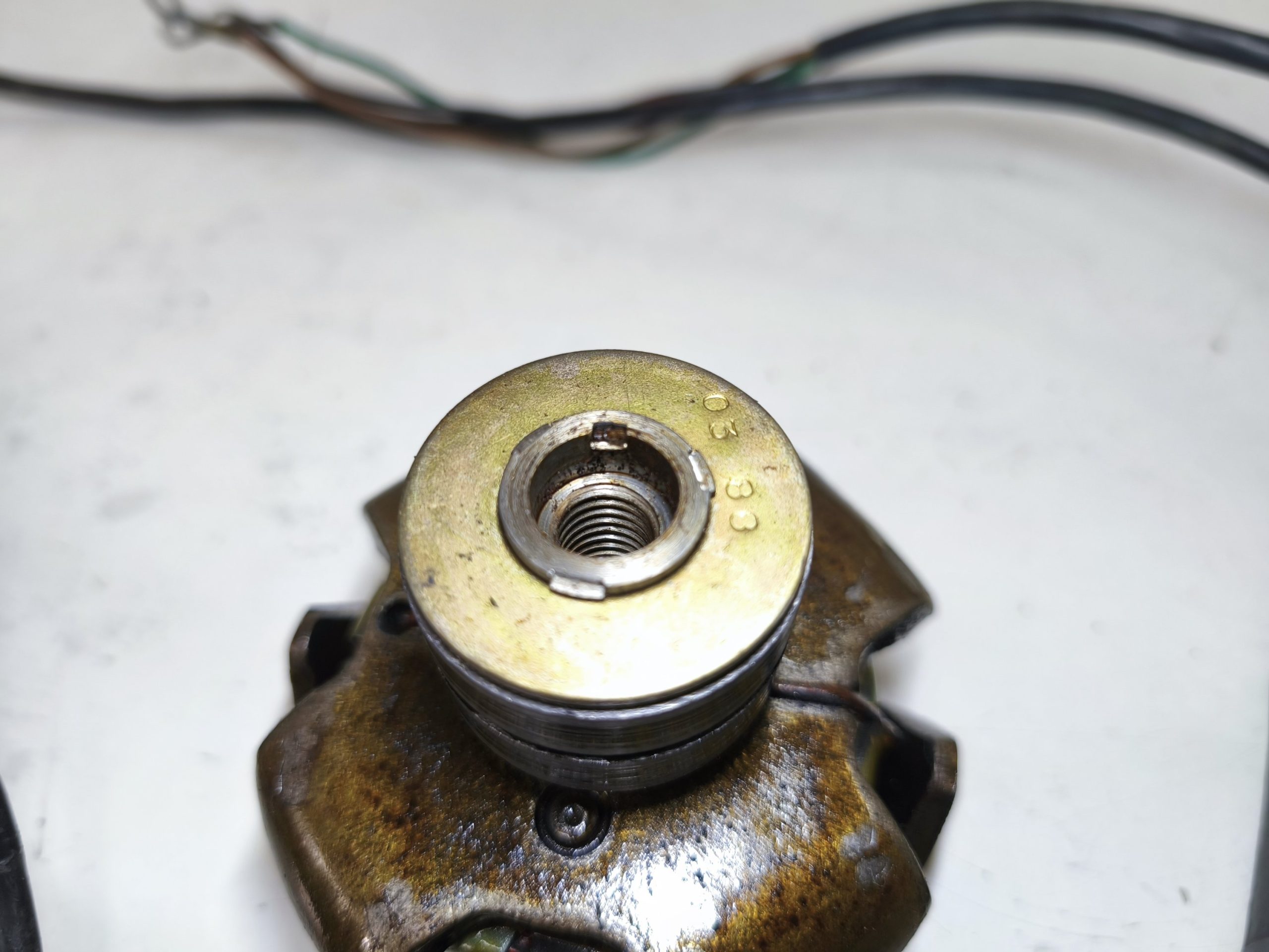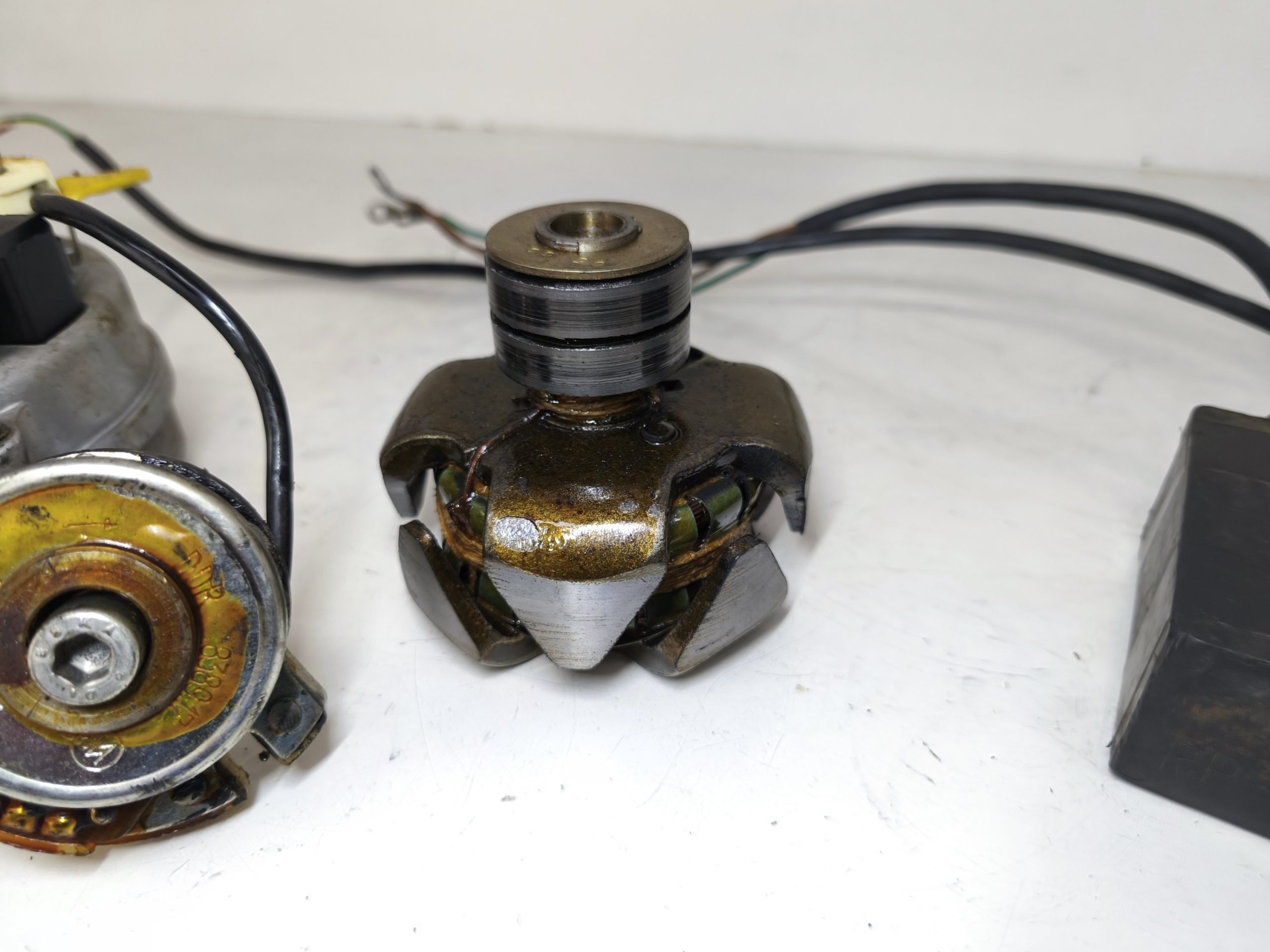 Zapłon elektroniczny MZ ETZ 250 251 125 150. Zestaw przed demontażem sprawny, dawał iskrę. Wirnik w ładnym stanie, gwint oraz mocowanie krzywki w dobrym stanie. Stojan w ładnym stanie. Czujnik Halla z ładnym magnesem. Całość wygląda na mało używany zestaw w bardzo ładnym stanie wizualnym.